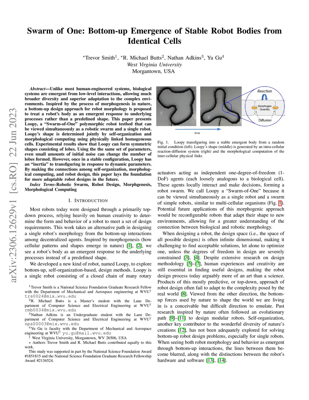 Unlike most human-engineered systems, biological systems are emergent from low-level interactions, allowing much broader diversity and superior adaptation to the complex environments. Inspired by the process of morphogenesis in nature, a bottom-up design approach for robot morphology is proposed to treat a robot's body as an emergent response to underlying processes rather than a predefined shape. This paper presents Loopy, a "Swarm-of-One" polymorphic robot testbed that can be viewed simultaneously as a robotic swarm and a single robot. Loopy's shape is determined jointly by self-organization and morphological computing using physically linked homogeneous cells. Experimental results show that Loopy can form symmetric shapes consisting of lobes. Using the the same set of parameters, even small amounts of initial noise can change the number of lobes formed. However, once in a stable configuration, Loopy has an "inertia" to transfiguring in response to dynamic parameters. By making the connections among self-organization, morphological computing, and robot design, this paper lays the foundation for more adaptable robot designs in the future.