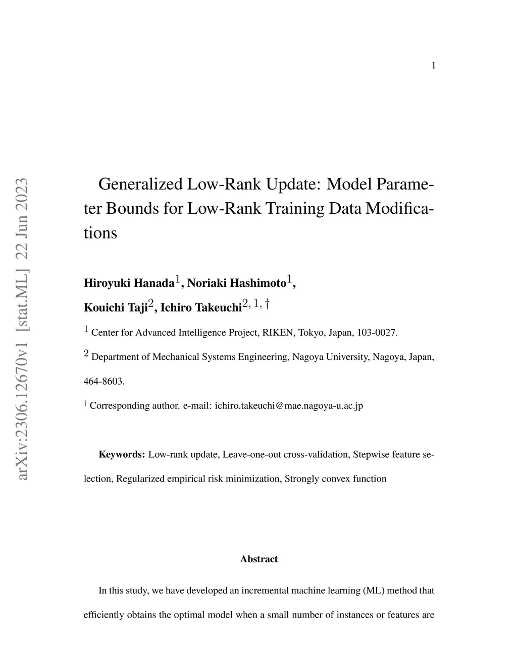 In this study, we have developed an incremental machine learning (ML) method that efficiently obtains the optimal model when a small number of instances or features are added or removed. This problem holds practical importance in model selection, such as cross-validation (CV) and feature selection. Among the class of ML methods known as linear estimators, there exists an efficient model update framework called the low-rank update that can effectively handle changes in a small number of rows and columns within the data matrix. However, for ML methods beyond linear estimators, there is currently no comprehensive framework available to obtain knowledge about the updated solution within a specific computational complexity. In light of this, our study introduces a method called the Generalized Low-Rank Update (GLRU) which extends the low-rank update framework of linear estimators to ML methods formulated as a certain class of regularized empirical risk minimization, including commonly used methods such as SVM and logistic regression. The proposed GLRU method not only expands the range of its applicability but also provides information about the updated solutions with a computational complexity proportional to the amount of dataset changes. To demonstrate the effectiveness of the GLRU method, we conduct experiments showcasing its efficiency in performing cross-validation and feature selection compared to other baseline methods.