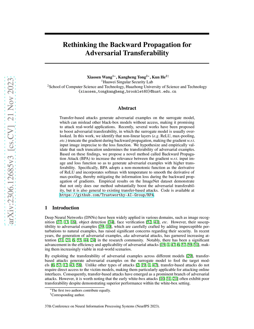 Transfer-based attacks generate adversarial examples on the surrogate model, which can mislead other black-box models without access, making it promising to attack real-world applications. Recently, several works have been proposed to boost adversarial transferability, in which the surrogate model is usually overlooked. In this work, we identify that non-linear layers (e.g., ReLU, max-pooling, etc.) truncate the gradient during backward propagation, making the gradient w.r.t. input image imprecise to the loss function. We hypothesize and empirically validate that such truncation undermines the transferability of adversarial examples. Based on these findings, we propose a novel method called Backward Propagation Attack (BPA) to increase the relevance between the gradient w.r.t. input image and loss function so as to generate adversarial examples with higher transferability. Specifically, BPA adopts a non-monotonic function as the derivative of ReLU and incorporates softmax with temperature to smooth the derivative of max-pooling, thereby mitigating the information loss during the backward propagation of gradients. Empirical results on the ImageNet dataset demonstrate that not only does our method substantially boost the adversarial transferability, but it is also general to existing transfer-based attacks. Code is available at https://github.com/Trustworthy-AI-Group/RPA.