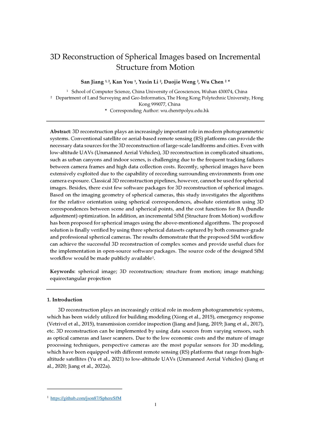 3D reconstruction plays an increasingly important role in modern photogrammetric systems. Conventional satellite or aerial-based remote sensing (RS) platforms can provide the necessary data sources for the 3D reconstruction of large-scale landforms and cities. Even with low-altitude UAVs (Unmanned Aerial Vehicles), 3D reconstruction in complicated situations, such as urban canyons and indoor scenes, is challenging due to the frequent tracking failures between camera frames and high data collection costs. Recently, spherical images have been extensively exploited due to the capability of recording surrounding environments from one camera exposure. Classical 3D reconstruction pipelines, however, cannot be used for spherical images. Besides, there exist few software packages for 3D reconstruction of spherical images. Based on the imaging geometry of spherical cameras, this study investigates the algorithms for the relative orientation using spherical correspondences, absolute orientation using 3D correspondences between scene and spherical points, and the cost functions for BA (bundle adjustment) optimization. In addition, an incremental SfM (Structure from Motion) workflow has been proposed for spherical images using the above-mentioned algorithms. The proposed solution is finally verified by using three spherical datasets captured by both consumer-grade and professional spherical cameras. The results demonstrate that the proposed SfM workflow can achieve the successful 3D reconstruction of complex scenes and provide useful clues for the implementation in open-source software packages. The source code of the designed SfM workflow would be made publicly available.