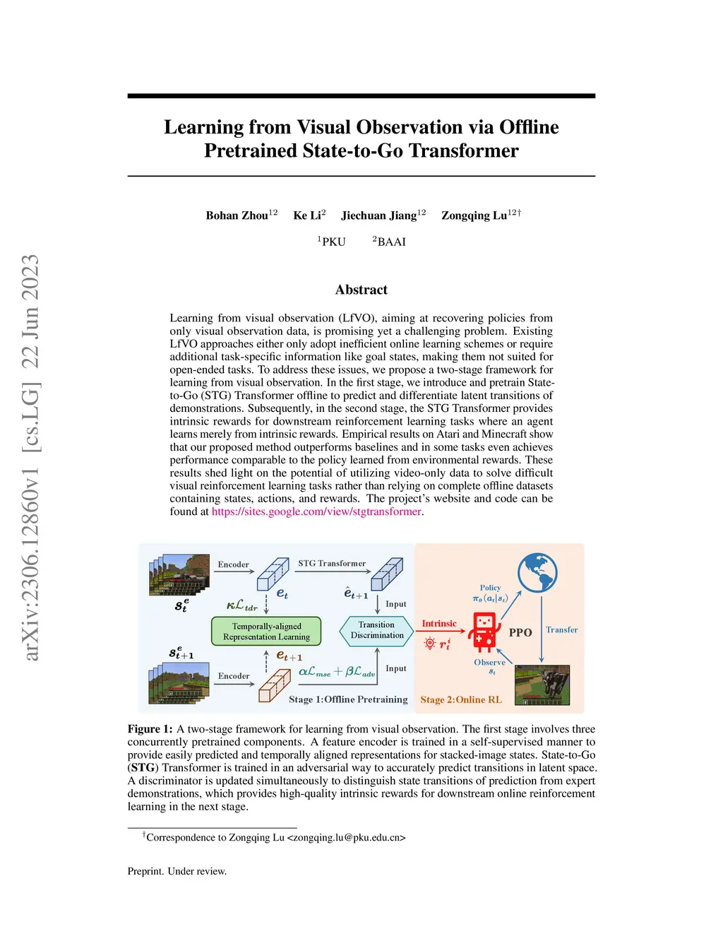 Learning from visual observation (LfVO), aiming at recovering policies from only visual observation data, is promising yet a challenging problem. Existing LfVO approaches either only adopt inefficient online learning schemes or require additional task-specific information like goal states, making them not suited for open-ended tasks. To address these issues, we propose a two-stage framework for learning from visual observation. In the first stage, we introduce and pretrain State-to-Go (STG) Transformer offline to predict and differentiate latent transitions of demonstrations. Subsequently, in the second stage, the STG Transformer provides intrinsic rewards for downstream reinforcement learning tasks where an agent learns merely from intrinsic rewards. Empirical results on Atari and Minecraft show that our proposed method outperforms baselines and in some tasks even achieves performance comparable to the policy learned from environmental rewards. These results shed light on the potential of utilizing video-only data to solve difficult visual reinforcement learning tasks rather than relying on complete offline datasets containing states, actions, and rewards. The project's website and code can be found at https://sites.google.com/view/stgtransformer.