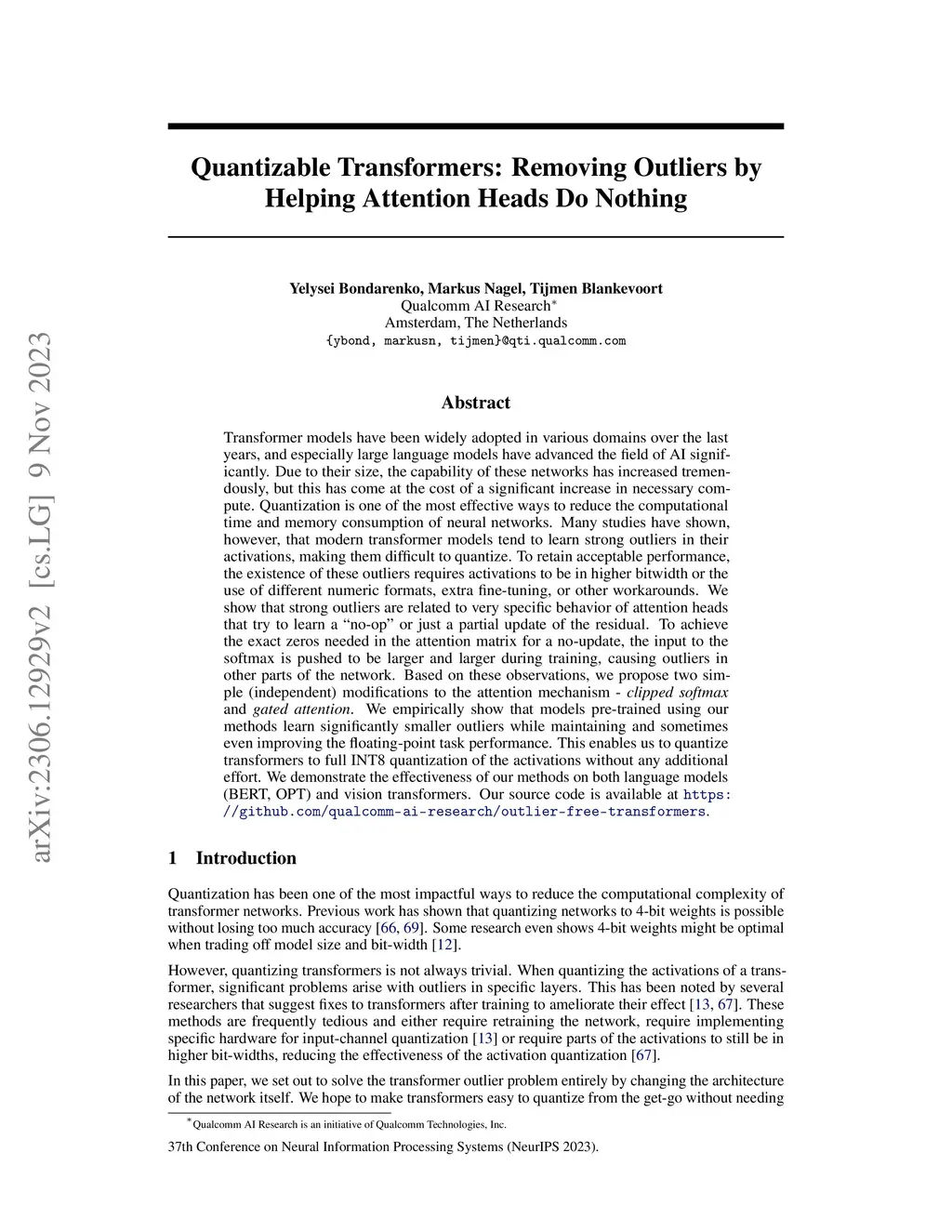 Transformer models have been widely adopted in various domains over the last years, and especially large language models have advanced the field of AI significantly. Due to their size, the capability of these networks has increased tremendously, but this has come at the cost of a significant increase in necessary compute. Quantization is one of the most effective ways to reduce the computational time and memory consumption of neural networks. Many studies have shown, however, that modern transformer models tend to learn strong outliers in their activations, making them difficult to quantize. To retain acceptable performance, the existence of these outliers requires activations to be in higher bitwidth or the use of different numeric formats, extra fine-tuning, or other workarounds. We show that strong outliers are related to very specific behavior of attention heads that try to learn a "no-op" or just a partial update of the residual. To achieve the exact zeros needed in the attention matrix for a no-update, the input to the softmax is pushed to be larger and larger during training, causing outliers in other parts of the network. Based on these observations, we propose two simple (independent) modifications to the attention mechanism - clipped softmax and gated attention. We empirically show that models pre-trained using our methods learn significantly smaller outliers while maintaining and sometimes even improving the floating-point task performance. This enables us to quantize transformers to full INT8 quantization of the activations without any additional effort. We demonstrate the effectiveness of our methods on both language models (BERT, OPT) and vision transformers.