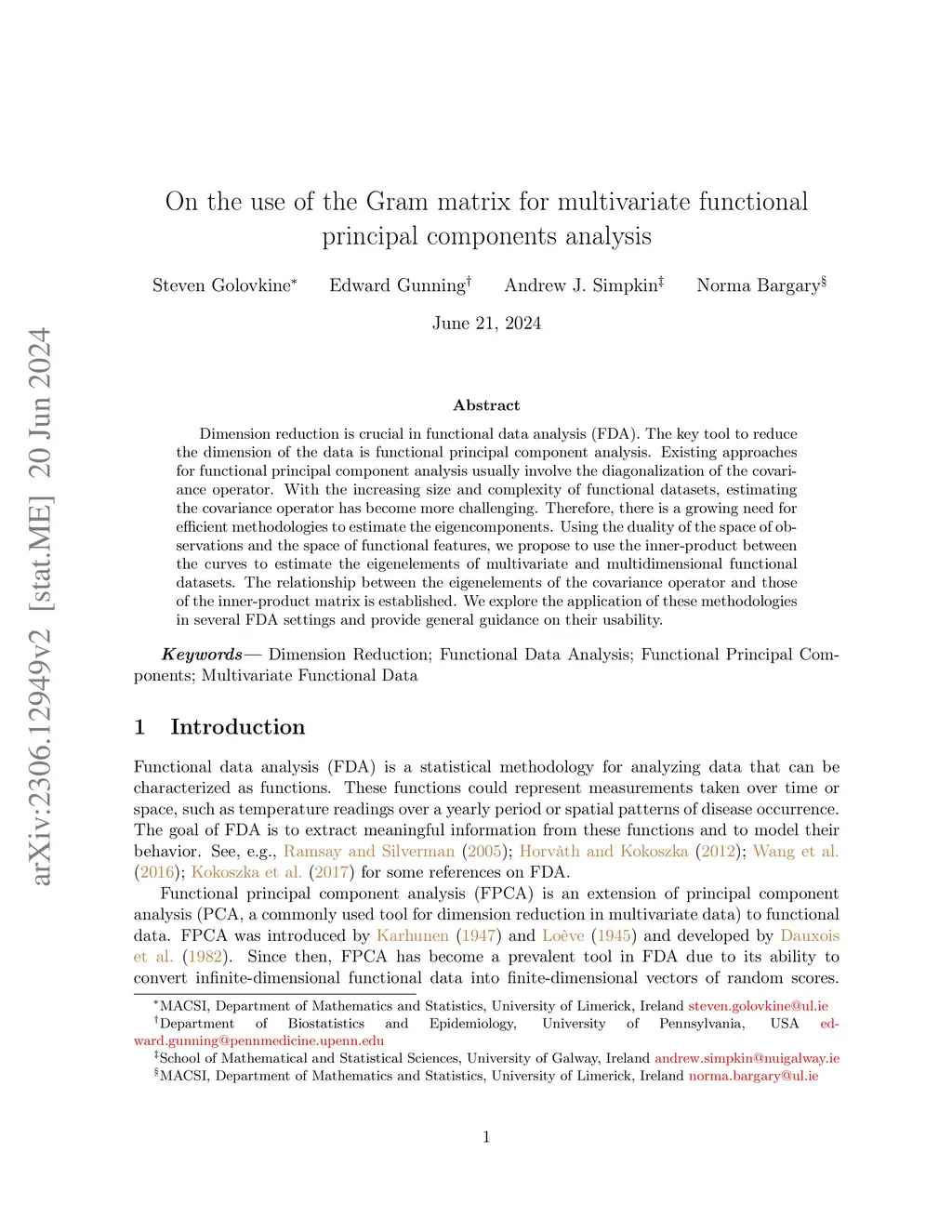 Dimension reduction is crucial in functional data analysis (FDA). The key tool to reduce the dimension of the data is functional principal component analysis. Existing approaches for functional principal component analysis usually involve the diagonalization of the covariance operator. With the increasing size and complexity of functional datasets, estimating the covariance operator has become more challenging. Therefore, there is a growing need for efficient methodologies to estimate the eigencomponents. Using the duality of the space of observations and the space of functional features, we propose to use the inner-product between the curves to estimate the eigenelements of multivariate and multidimensional functional datasets. The relationship between the eigenelements of the covariance operator and those of the inner-product matrix is established. We explore the application of these methodologies in several FDA settings and provide general guidance on their usability.