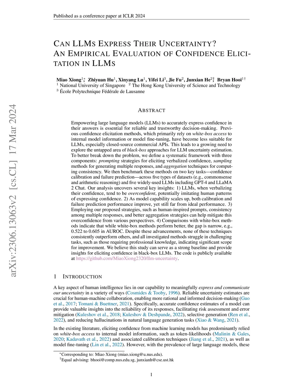 Empowering large language models to accurately express confidence in their answers is essential for trustworthy decision-making. Previous confidence elicitation methods, which primarily rely on white-box access to internal model information or model fine-tuning, have become less suitable for LLMs, especially closed-source commercial APIs. This leads to a growing need to explore the untapped area of black-box approaches for LLM uncertainty estimation. To better break down the problem, we define a systematic framework with three components: prompting strategies for eliciting verbalized confidence, sampling methods for generating multiple responses, and aggregation techniques for computing consistency. We then benchmark these methods on two key tasks-confidence calibration and failure prediction-across five types of datasets (e.g., commonsense and arithmetic reasoning) and five widely-used LLMs including GPT-4 and LLaMA 2 Chat. Our analysis uncovers several key insights: 1) LLMs, when verbalizing their confidence, tend to be overconfident, potentially imitating human patterns of expressing confidence. 2) As model capability scales up, both calibration and failure prediction performance improve. 3) Employing our proposed strategies, such as human-inspired prompts, consistency among multiple responses, and better aggregation strategies can help mitigate this overconfidence from various perspectives. 4) Comparisons with white-box methods indicate that while white-box methods perform better, the gap is narrow, e.g., 0.522 to 0.605 in AUROC. Despite these advancements, none of these techniques consistently outperform others, and all investigated methods struggle in challenging tasks, such as those requiring professional knowledge, indicating significant scope for improvement. We believe this study can serve as a strong baseline and provide insights for eliciting confidence in black-box LLMs.