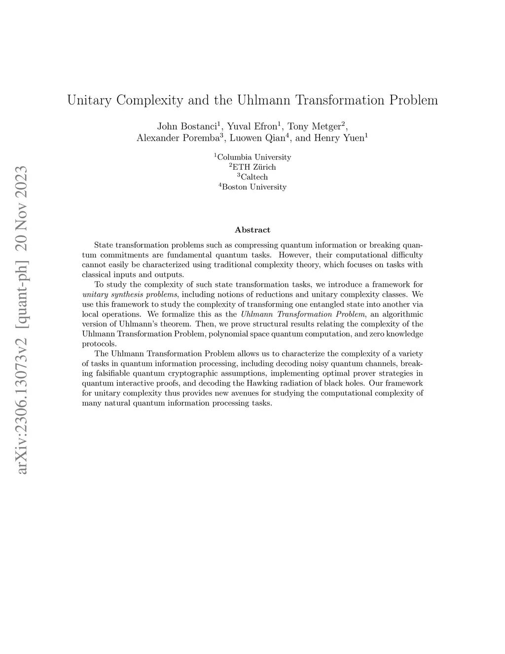 State transformation problems such as compressing quantum information or breaking quantum commitments are fundamental quantum tasks. However, their computational difficulty cannot easily be characterized using traditional complexity theory, which focuses on tasks with classical inputs and outputs.To study the complexity of such state transformation tasks, we introduce a framework for unitary synthesis problems, including notions of reductions and unitary complexity classes. We use this framework to study the complexity of transforming one entangled state into another via local operations. We formalize this as the Uhlmann Transformation Problem, an algorithmic version of Uhlmann's theorem. Then, we prove structural results relating the complexity of the Uhlmann Transformation Problem, polynomial space quantum computation, and zero knowledge protocols.The Uhlmann Transformation Problem allows us to characterize the complexity of a variety of tasks in quantum information processing, including decoding noisy quantum channels, breaking falsifiable quantum cryptographic assumptions, implementing optimal prover strategies in quantum interactive proofs, and decoding the Hawking radiation of black holes. Our framework for unitary complexity thus provides new avenues for studying the computational complexity of many natural quantum information processing tasks.