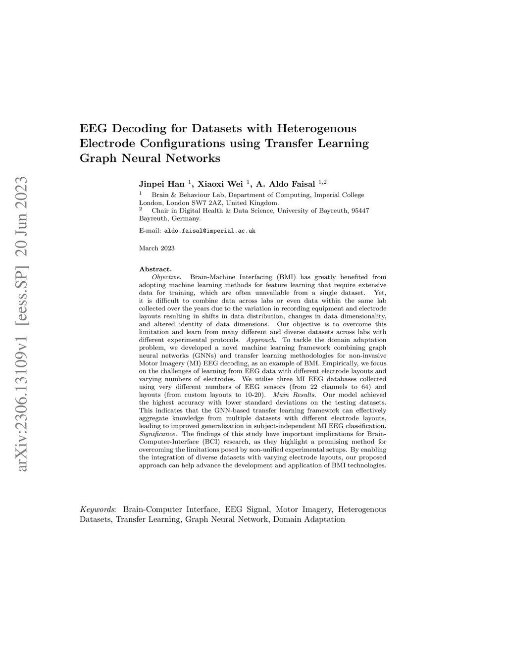Brain-Machine Interfacing (BMI) has greatly benefited from adopting machine learning methods for feature learning that require extensive data for training, which are often unavailable from a single dataset. Yet, it is difficult to combine data across labs or even data within the same lab collected over the years due to the variation in recording equipment and electrode layouts resulting in shifts in data distribution, changes in data dimensionality, and altered identity of data dimensions. Our objective is to overcome this limitation and learn from many different and diverse datasets across labs with different experimental protocols. To tackle the domain adaptation problem, we developed a novel machine learning framework combining graph neural networks (GNNs) and transfer learning methodologies for non-invasive Motor Imagery (MI) EEG decoding, as an example of BMI. Empirically, we focus on the challenges of learning from EEG data with different electrode layouts and varying numbers of electrodes. We utilise three MI EEG databases collected using very different numbers of EEG sensors (from 22 channels to 64) and layouts (from custom layouts to 10-20). Our model achieved the highest accuracy with lower standard deviations on the testing datasets. This indicates that the GNN-based transfer learning framework can effectively aggregate knowledge from multiple datasets with different electrode layouts, leading to improved generalization in subject-independent MI EEG classification. The findings of this study have important implications for Brain-Computer-Interface (BCI) research, as they highlight a promising method for overcoming the limitations posed by non-unified experimental setups. By enabling the integration of diverse datasets with varying electrode layouts, our proposed approach can help advance the development and application of BMI technologies.