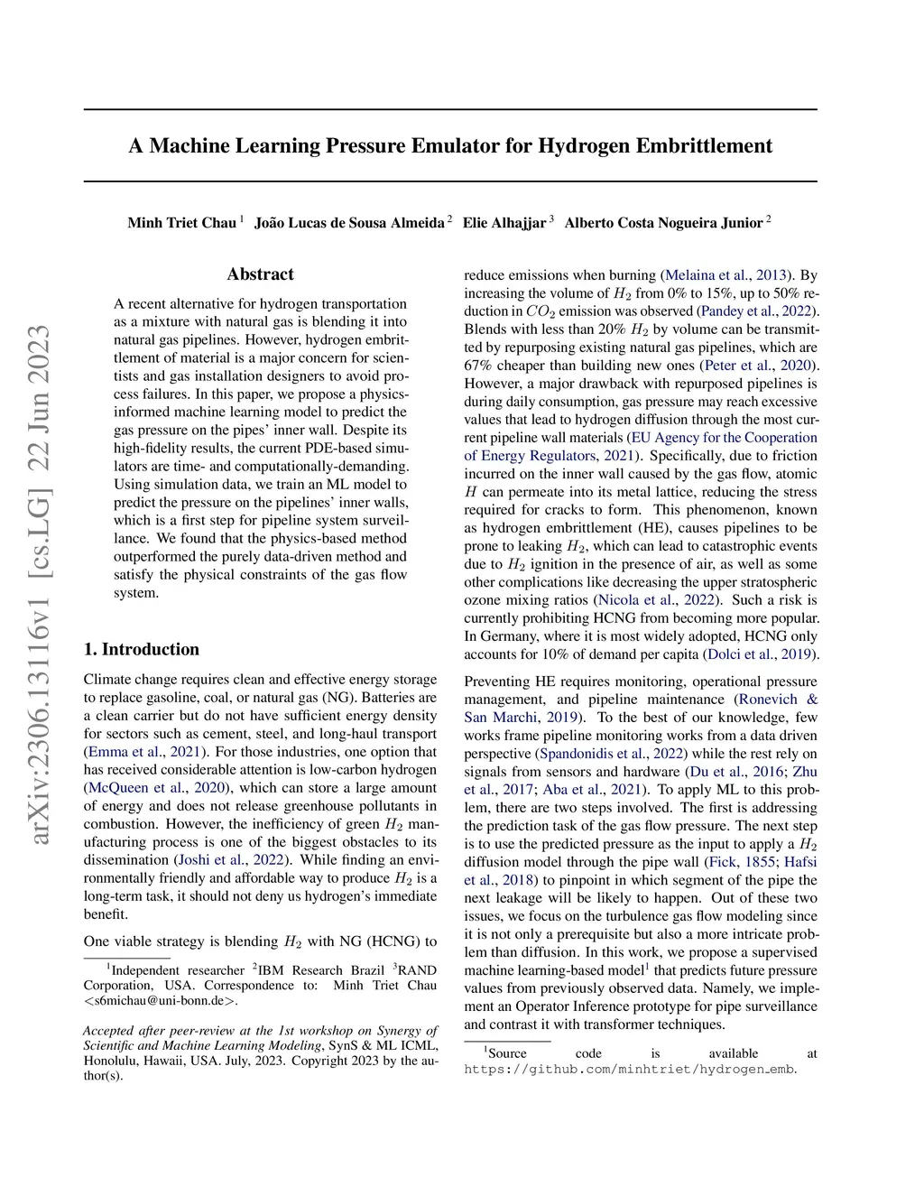 A recent alternative for hydrogen transportation as a mixture with natural gas is blending it into natural gas pipelines. However, hydrogen embrittlement of material is a major concern for scientists and gas installation designers to avoid process failures. In this paper, we propose a physics-informed machine learning model to predict the gas pressure on the pipes' inner wall. Despite its high-fidelity results, the current PDE-based simulators are time- and computationally-demanding. Using simulation data, we train an ML model to predict the pressure on the pipelines' inner walls, which is a first step for pipeline system surveillance. We found that the physics-based method outperformed the purely data-driven method and satisfy the physical constraints of the gas flow system.