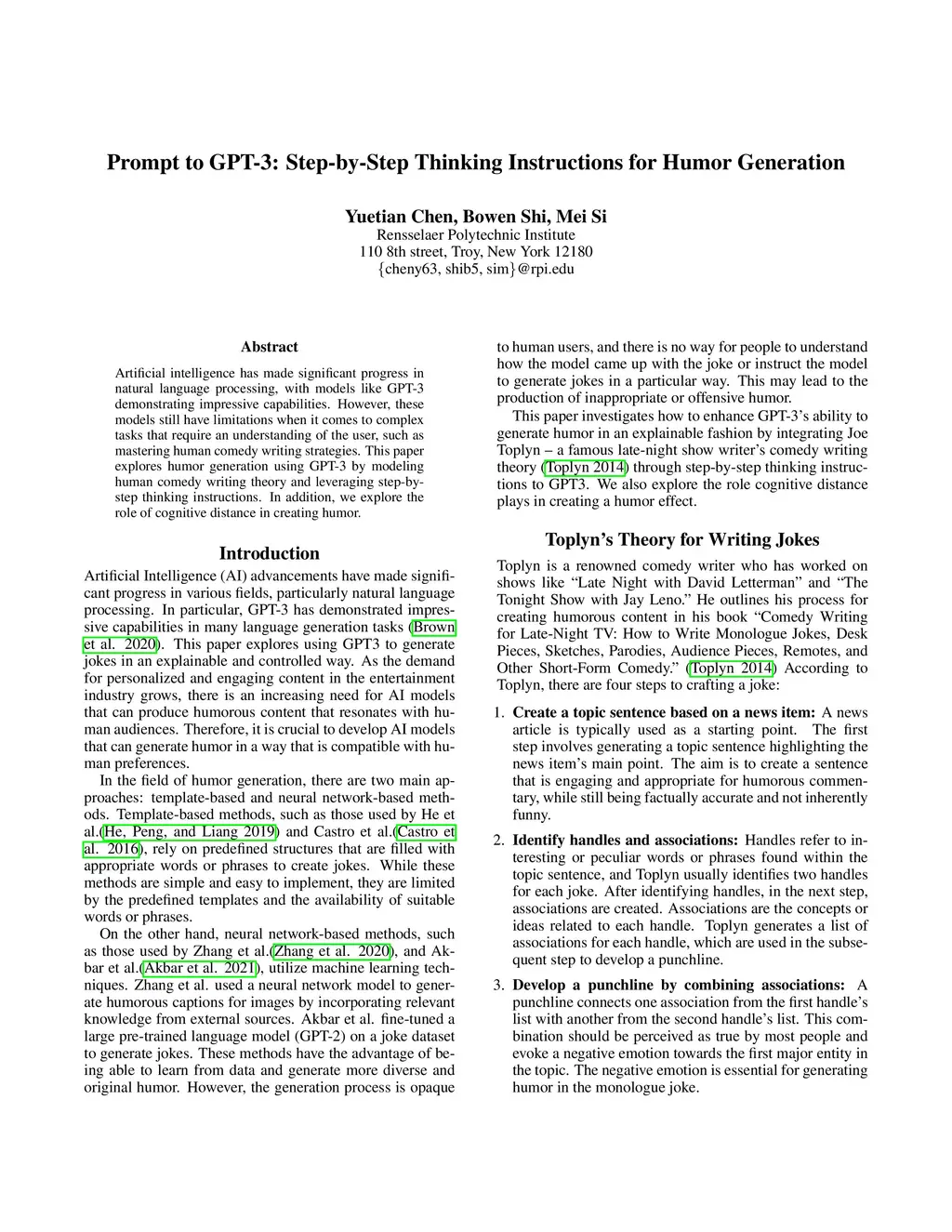 Artificial intelligence has made significant progress in natural language processing, with models like GPT-3 demonstrating impressive capabilities. However, these models still have limitations when it comes to complex tasks that require an understanding of the user, such as mastering human comedy writing strategies. This paper explores humor generation using GPT-3 by modeling human comedy writing theory and leveraging step-by-step thinking instructions. In addition, we explore the role of cognitive distance in creating humor.