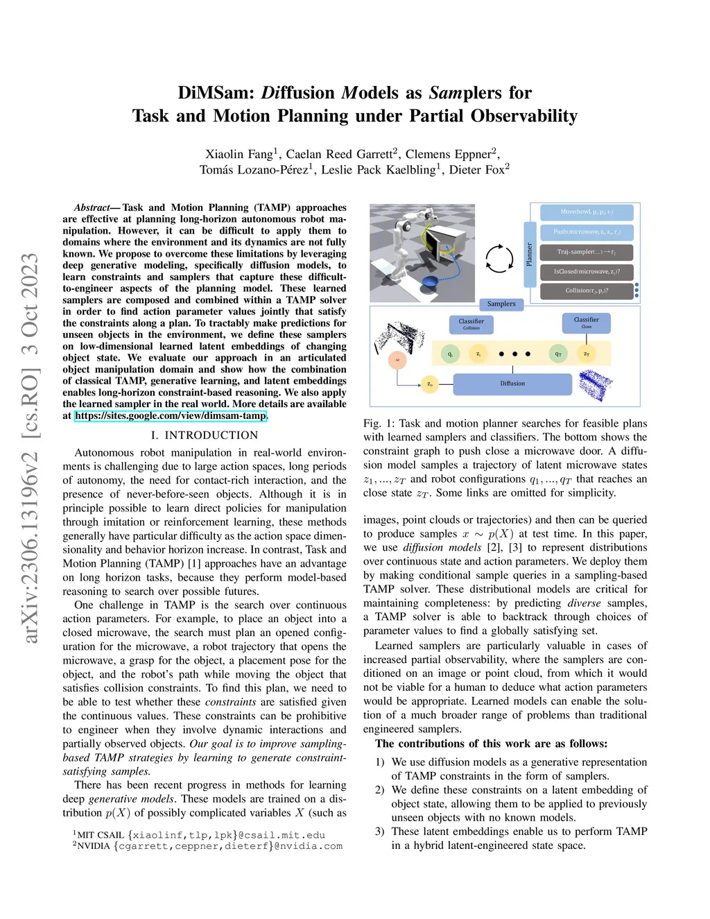 Task and Motion Planning (TAMP) approaches are effective at planning long-horizon autonomous robot manipulation. However, it can be difficult to apply them to domains where the environment and its dynamics are not fully known. We propose to overcome these limitations by leveraging deep generative modeling, specifically diffusion models, to learn constraints and samplers that capture these difficult-to-engineer aspects of the planning model. These learned samplers are composed and combined within a TAMP solver in order to find action parameter values jointly that satisfy the constraints along a plan. To tractably make predictions for unseen objects in the environment, we define these samplers on low-dimensional learned latent embeddings of changing object state. We evaluate our approach in an articulated object manipulation domain and show how the combination of classical TAMP, generative learning, and latent embeddings enables long-horizon constraint-based reasoning. We also apply the learned sampler in the real world. More details are available at https://sites.google.com/view/dimsam-tamp