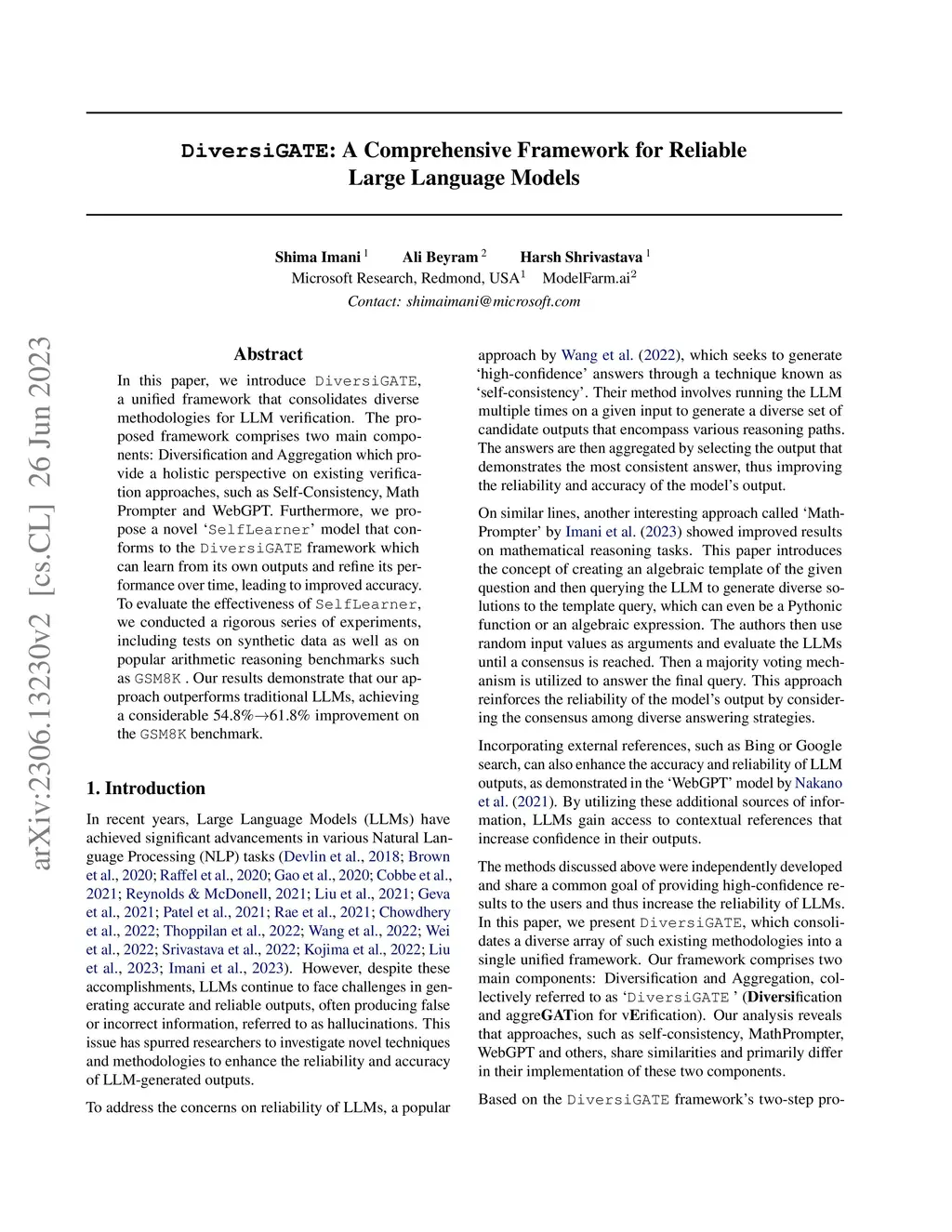 In this paper, we introduce DiversiGATE, a unified framework that consolidates diverse methodologies for LLM verification. The proposed framework comprises two main components: Diversification and Aggregation which provide a holistic perspective on existing verification approaches, such as Self-Consistency, Math Prompter and WebGPT. Furthermore, we propose a novel `SelfLearner' model that conforms to the DiversiGATE framework which can learn from its own outputs and refine its performance over time, leading to improved accuracy. To evaluate the effectiveness of SelfLearner, we conducted a rigorous series of experiments, including tests on synthetic data as well as on popular arithmetic reasoning benchmarks such as GSM8K. Our results demonstrate that our approach outperforms traditional LLMs, achieving a considerable 54.8% -> 61.8% improvement on the GSM8K benchmark.