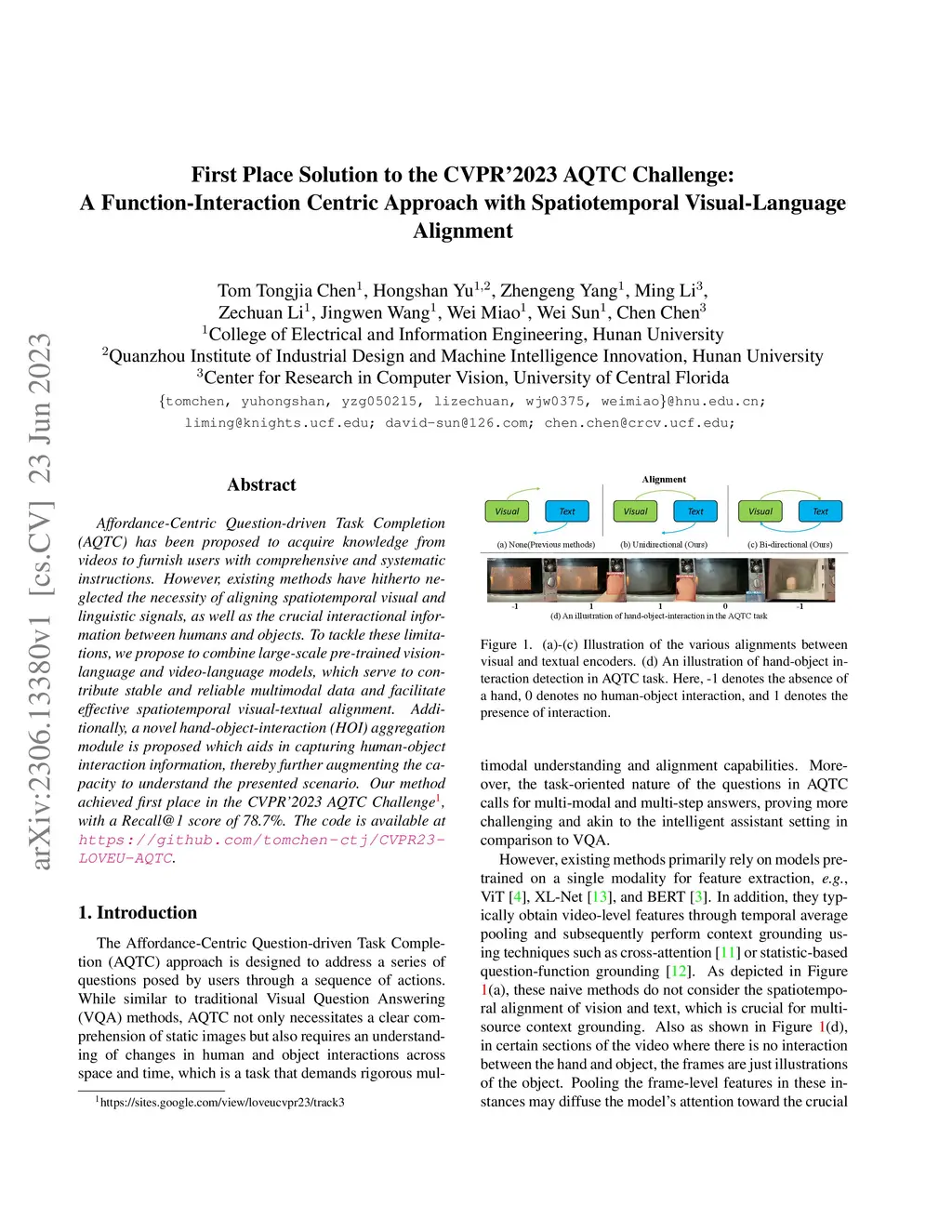 Affordance-Centric Question-driven Task Completion (AQTC) has been proposed to acquire knowledge from videos to furnish users with comprehensive and systematic instructions. However, existing methods have hitherto neglected the necessity of aligning spatiotemporal visual and linguistic signals, as well as the crucial interactional information between humans and objects. To tackle these limitations, we propose to combine large-scale pre-trained vision-language and video-language models, which serve to contribute stable and reliable multimodal data and facilitate effective spatiotemporal visual-textual alignment. Additionally, a novel hand-object-interaction (HOI) aggregation module is proposed which aids in capturing human-object interaction information, thereby further augmenting the capacity to understand the presented scenario. Our method achieved first place in the CVPR'2023 AQTC Challenge, with a Recall@1 score of 78.7\%. The code is available at https://github.com/tomchen-ctj/CVPR23-LOVEU-AQTC.