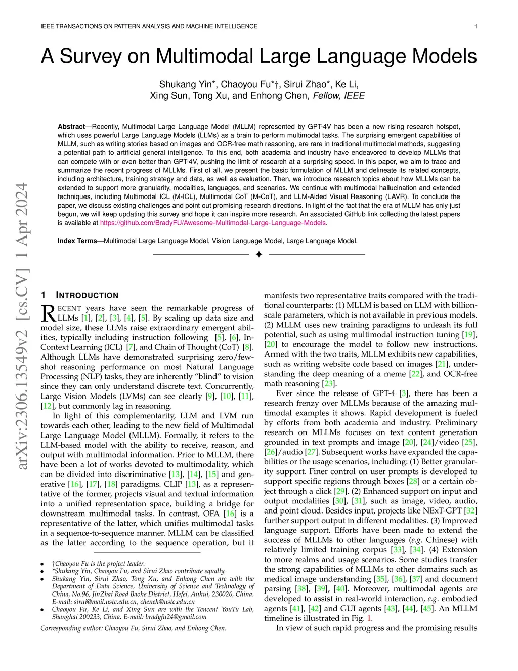 Recently, Multimodal Large Language Model (MLLM) represented by GPT-4V has been a new rising research hotspot, which uses powerful Large Language Models (LLMs) as a brain to perform multimodal tasks. The surprising emergent capabilities of MLLM, such as writing stories based on images and OCR-free math reasoning, are rare in traditional multimodal methods, suggesting a potential path to artificial general intelligence. To this end, both academia and industry have endeavored to develop MLLMs that can compete with or even better than GPT-4V, pushing the limit of research at a surprising speed. In this paper, we aim to trace and summarize the recent progress of MLLMs. First of all, we present the basic formulation of MLLM and delineate its related concepts, including architecture, training strategy and data, as well as evaluation. Then, we introduce research topics about how MLLMs can be extended to support more granularity, modalities, languages, and scenarios. We continue with multimodal hallucination and extended techniques, including Multimodal ICL (M-ICL), Multimodal CoT (M-CoT), and LLM-Aided Visual Reasoning (LAVR). To conclude the paper, we discuss existing challenges and point out promising research directions. In light of the fact that the era of MLLM has only just begun, we will keep updating this survey and hope it can inspire more research. An associated GitHub link collecting the latest papers is available at https://github.com/BradyFU/Awesome-Multimodal-Large-Language-Models.