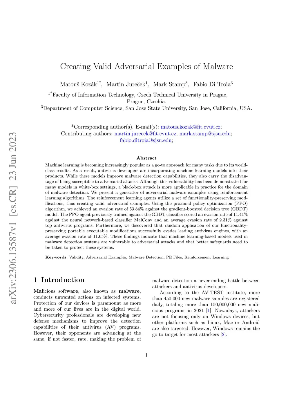 Machine learning is becoming increasingly popular as a go-to approach for many tasks due to its world-class results. As a result, antivirus developers are incorporating machine learning models into their products. While these models improve malware detection capabilities, they also carry the disadvantage of being susceptible to adversarial attacks. Although this vulnerability has been demonstrated for many models in white-box settings, a black-box attack is more applicable in practice for the domain of malware detection. We present a generator of adversarial malware examples using reinforcement learning algorithms. The reinforcement learning agents utilize a set of functionality-preserving modifications, thus creating valid adversarial examples. Using the proximal policy optimization (PPO) algorithm, we achieved an evasion rate of 53.84% against the gradient-boosted decision tree (GBDT) model. The PPO agent previously trained against the GBDT classifier scored an evasion rate of 11.41% against the neural network-based classifier MalConv and an average evasion rate of 2.31% against top antivirus programs. Furthermore, we discovered that random application of our functionality-preserving portable executable modifications successfully evades leading antivirus engines, with an average evasion rate of 11.65%. These findings indicate that machine learning-based models used in malware detection systems are vulnerable to adversarial attacks and that better safeguards need to be taken to protect these systems.