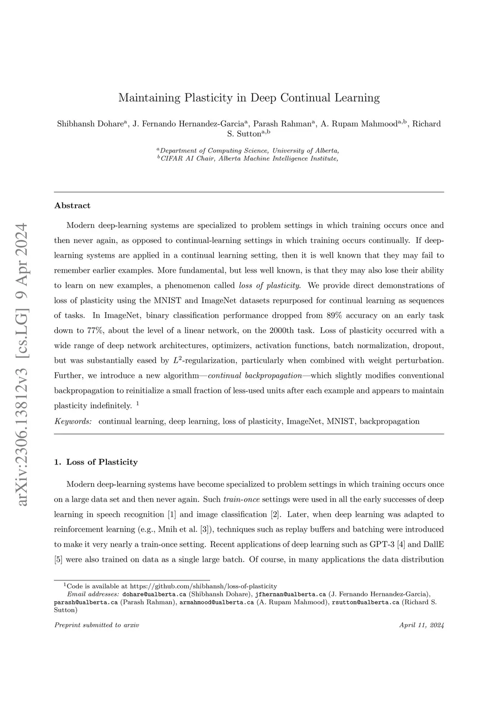 Modern deep-learning systems are specialized to problem settings in which training occurs once and then never again, as opposed to continual-learning settings in which training occurs continually. If deep-learning systems are applied in a continual learning setting, then it is well known that they may fail to remember earlier examples. More fundamental, but less well known, is that they may also lose their ability to learn on new examples, a phenomenon called loss of plasticity. We provide direct demonstrations of loss of plasticity using the MNIST and ImageNet datasets repurposed for continual learning as sequences of tasks. In ImageNet, binary classification performance dropped from 89% accuracy on an early task down to 77%, about the level of a linear network, on the 2000th task. Loss of plasticity occurred with a wide range of deep network architectures, optimizers, activation functions, batch normalization, dropout, but was substantially eased by L2-regularization, particularly when combined with weight perturbation. Further, we introduce a new algorithm -- continual backpropagation -- which slightly modifies conventional backpropagation to reinitialize a small fraction of less-used units after each example and appears to maintain plasticity indefinitely.