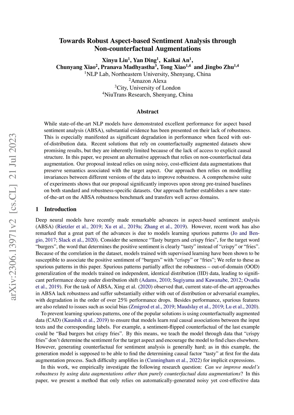 While state-of-the-art NLP models have demonstrated excellent performance for aspect based sentiment analysis (ABSA), substantial evidence has been presented on their lack of robustness. This is especially manifested as significant degradation in performance when faced with out-of-distribution data. Recent solutions that rely on counterfactually augmented datasets show promising results, but they are inherently limited because of the lack of access to explicit causal structure. In this paper, we present an alternative approach that relies on non-counterfactual data augmentation. Our proposal instead relies on using noisy, cost-efficient data augmentations that preserve semantics associated with the target aspect. Our approach then relies on modelling invariances between different versions of the data to improve robustness. A comprehensive suite of experiments shows that our proposal significantly improves upon strong pre-trained baselines on both standard and robustness-specific datasets. Our approach further establishes a new state-of-the-art on the ABSA robustness benchmark and transfers well across domains.