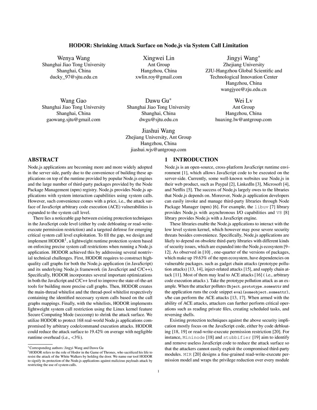 HODOR: Shrinking Attack Surface on Node.js via System Call Limitation