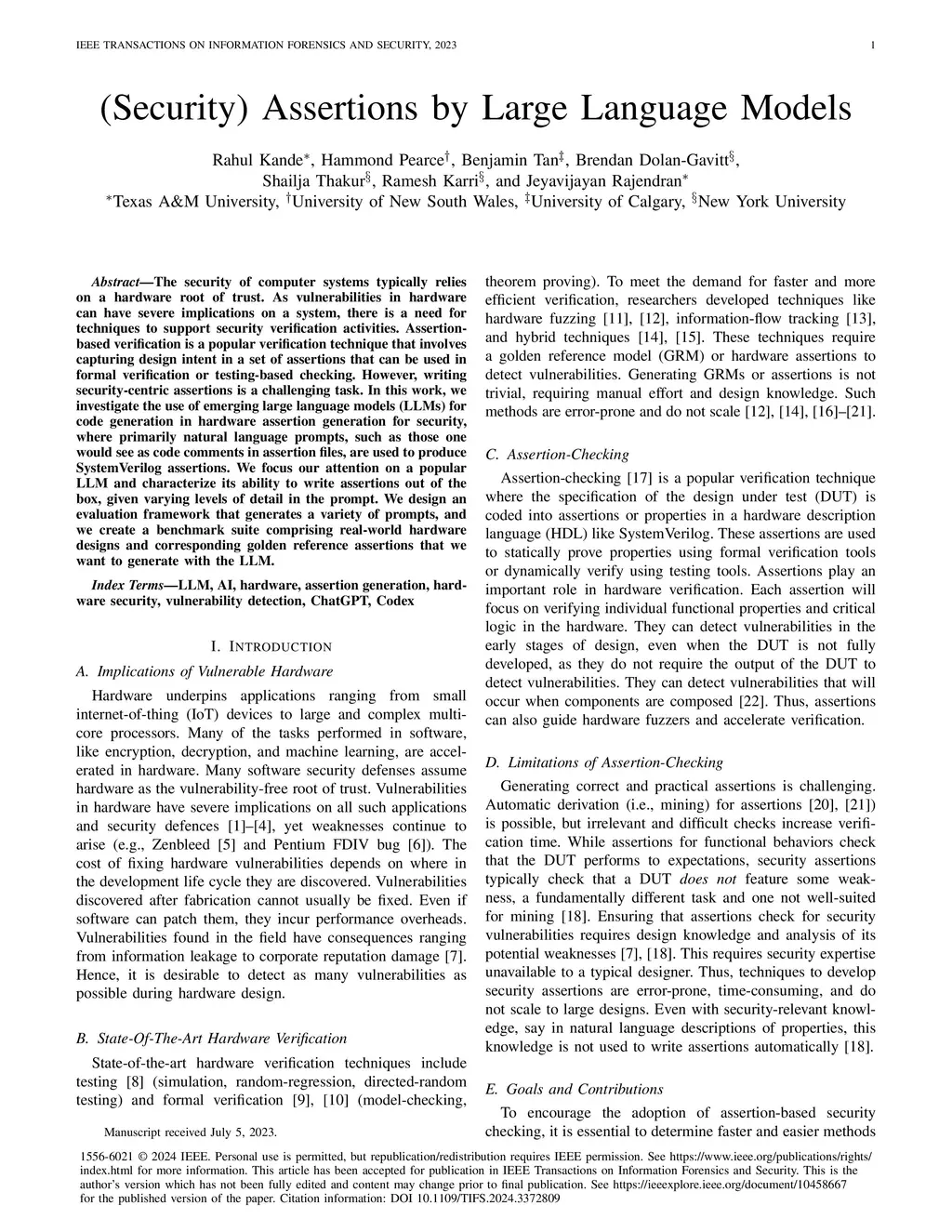The security of computer systems typically relies on a hardware root of trust. As vulnerabilities in hardware can have severe implications on a system, there is a need for techniques to support security verification activities. Assertion-based verification is a popular verification technique that involves capturing design intent in a set of assertions that can be used in formal verification or testing-based checking. However, writing security-centric assertions is a challenging task. In this work, we investigate the use of emerging large language models (LLMs) for code generation in hardware assertion generation for security, where primarily natural language prompts, such as those one would see as code comments in assertion files, are used to produce SystemVerilog assertions. We focus our attention on a popular LLM and characterize its ability to write assertions out of the box, given varying levels of detail in the prompt. We design an evaluation framework that generates a variety of prompts, and we create a benchmark suite comprising real-world hardware designs and corresponding golden reference assertions that we want to generate with the LLM.