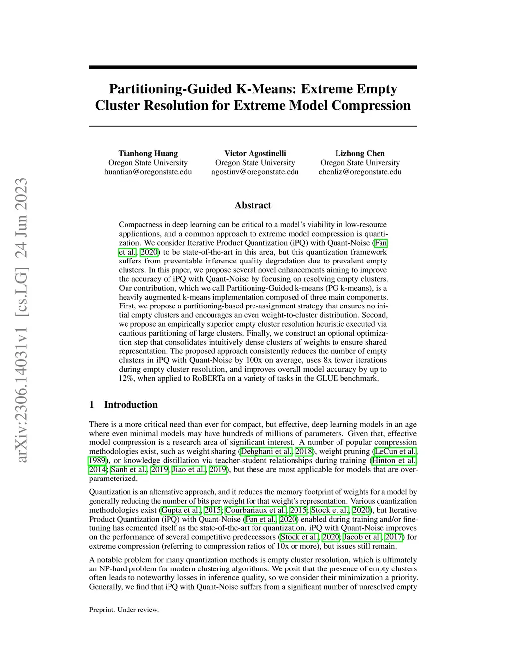 Compactness in deep learning can be critical to a model's viability in low-resource applications, and a common approach to extreme model compression is quantization. We consider Iterative Product Quantization (iPQ) with Quant-Noise to be state-of-the-art in this area, but this quantization framework suffers from preventable inference quality degradation due to prevalent empty clusters. In this paper, we propose several novel enhancements aiming to improve the accuracy of iPQ with Quant-Noise by focusing on resolving empty clusters. Our contribution, which we call Partitioning-Guided k-means (PG k-means), is a heavily augmented k-means implementation composed of three main components. First, we propose a partitioning-based pre-assignment strategy that ensures no initial empty clusters and encourages an even weight-to-cluster distribution. Second, we propose an empirically superior empty cluster resolution heuristic executed via cautious partitioning of large clusters. Finally, we construct an optional optimization step that consolidates intuitively dense clusters of weights to ensure shared representation. The proposed approach consistently reduces the number of empty clusters in iPQ with Quant-Noise by 100x on average, uses 8x fewer iterations during empty cluster resolution, and improves overall model accuracy by up to 12%, when applied to RoBERTa on a variety of tasks in the GLUE benchmark.
