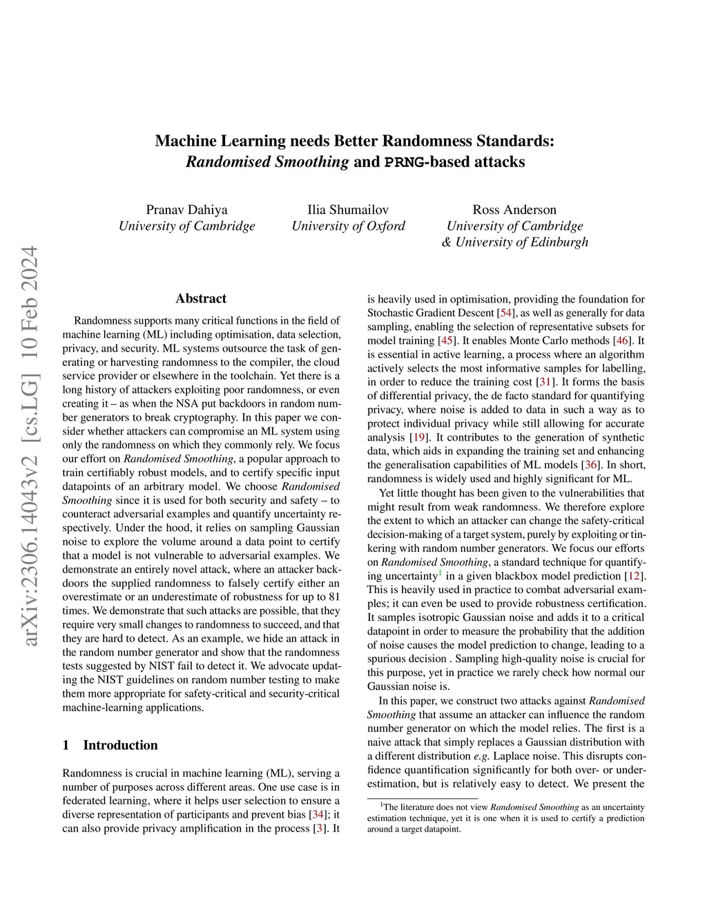Machine Learning needs Better Randomness Standards: Randomised Smoothing