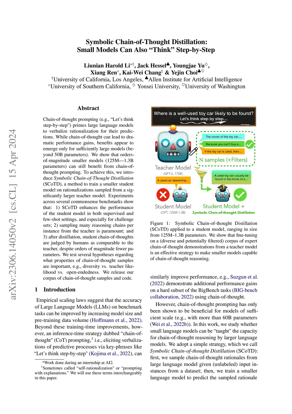 Chain-of-thought prompting (e.g., "Let's think step-by-step") primes large language models to verbalize rationalization for their predictions. While chain-of-thought can lead to dramatic performance gains, benefits appear to emerge only for sufficiently large models (beyond 50B parameters). We show that orders-of-magnitude smaller models (125M -- 1.3B parameters) can still benefit from chain-of-thought prompting. To achieve this, we introduce Symbolic Chain-of-Thought Distillation (SCoTD), a method to train a smaller student model on rationalizations sampled from a significantly larger teacher model. Experiments across several commonsense benchmarks show that: 1) SCoTD enhances the performance of the student model in both supervised and few-shot settings, and especially for challenge sets; 2) sampling many reasoning chains per instance from the teacher is paramount; and 3) after distillation, student chain-of-thoughts are judged by humans as comparable to the teacher, despite orders of magnitude fewer parameters. We test several hypotheses regarding what properties of chain-of-thought samples are important, e.g., diversity vs. teacher likelihood vs. open-endedness. We release our corpus of chain-of-thought samples and code.