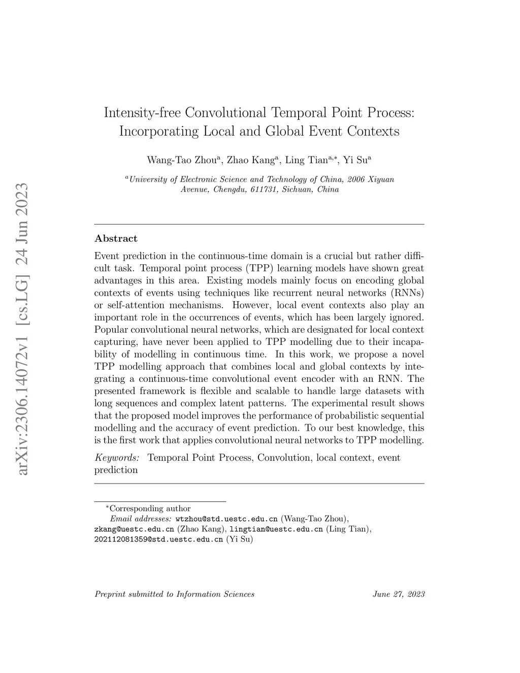 Event prediction in the continuous-time domain is a crucial but rather difficult task. Temporal point process (TPP) learning models have shown great advantages in this area. Existing models mainly focus on encoding global contexts of events using techniques like recurrent neural networks (RNNs) or self-attention mechanisms. However, local event contexts also play an important role in the occurrences of events, which has been largely ignored. Popular convolutional neural networks, which are designated for local context capturing, have never been applied to TPP modelling due to their incapability of modelling in continuous time. In this work, we propose a novel TPP modelling approach that combines local and global contexts by integrating a continuous-time convolutional event encoder with an RNN. The presented framework is flexible and scalable to handle large datasets with long sequences and complex latent patterns. The experimental result shows that the proposed model improves the performance of probabilistic sequential modelling and the accuracy of event prediction. To our best knowledge, this is the first work that applies convolutional neural networks to TPP modelling.