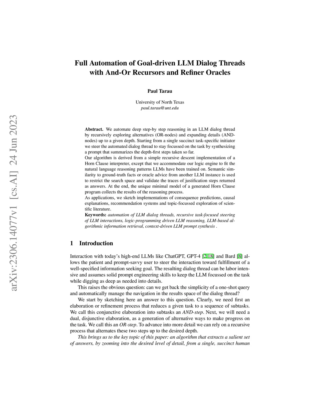 We automate deep step-by step reasoning in an LLM dialog thread by recursively exploring alternatives (OR-nodes) and expanding details (AND-nodes) up to a given depth. Starting from a single succinct task-specific initiator we steer the automated dialog thread to stay focussed on the task by synthesizing a prompt that summarizes the depth-first steps taken so far. Our algorithm is derived from a simple recursive descent implementation of a Horn Clause interpreter, except that we accommodate our logic engine to fit the natural language reasoning patterns LLMs have been trained on. Semantic similarity to ground-truth facts or oracle advice from another LLM instance is used to restrict the search space and validate the traces of justification steps returned as answers. At the end, the unique minimal model of a generated Horn Clause program collects the results of the reasoning process. As applications, we sketch implementations of consequence predictions, causal explanations, recommendation systems and topic-focussed exploration of scientific literature.