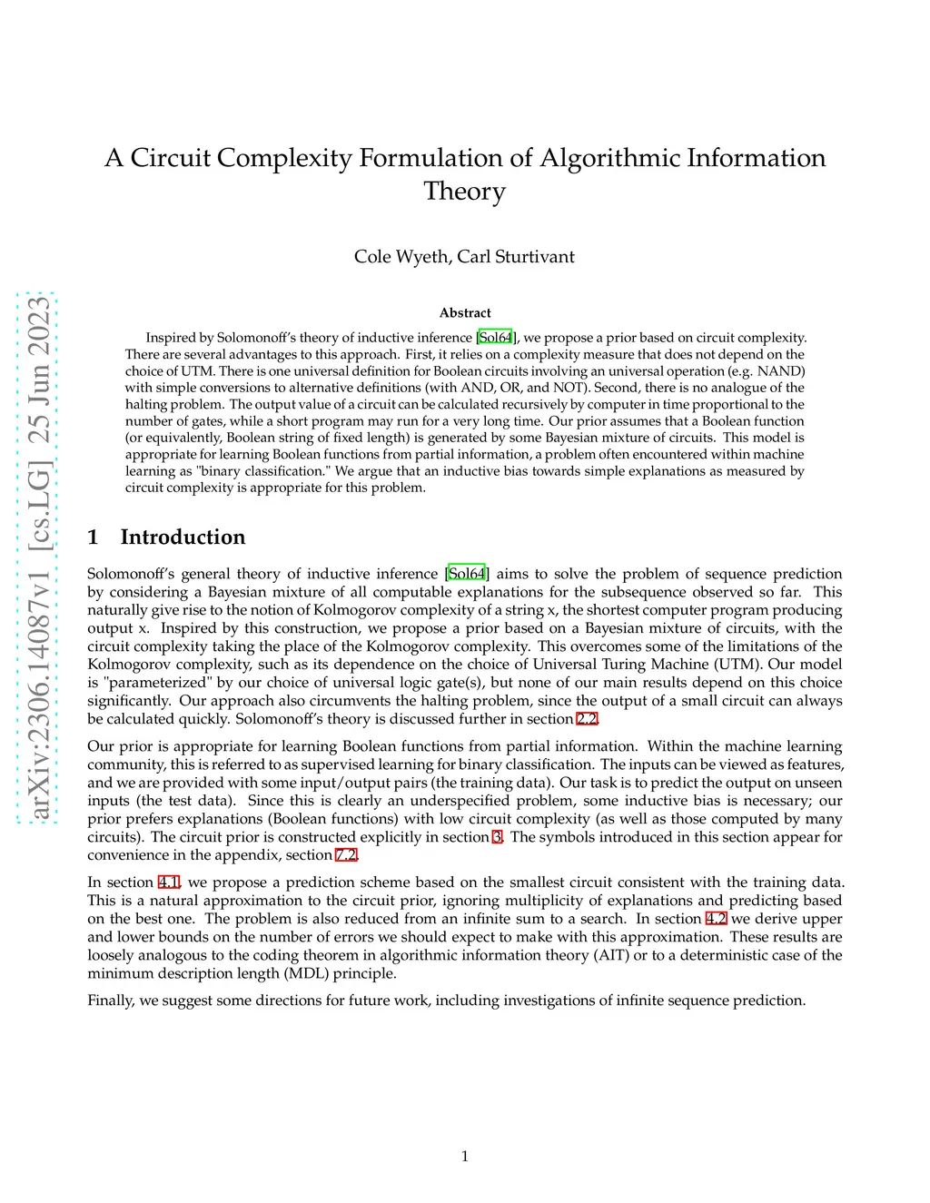 Inspired by Solomonoffs theory of inductive inference, we propose a prior based on circuit complexity. There are several advantages to this approach. First, it relies on a complexity measure that does not depend on the choice of UTM. There is one universal definition for Boolean circuits involving an universal operation such as nand with simple conversions to alternative definitions such as and, or, and not. Second, there is no analogue of the halting problem. The output value of a circuit can be calculated recursively by computer in time proportional to the number of gates, while a short program may run for a very long time. Our prior assumes that a Boolean function, or equivalently, Boolean string of fixed length, is generated by some Bayesian mixture of circuits. This model is appropriate for learning Boolean functions from partial information, a problem often encountered within machine learning as "binary classification." We argue that an inductive bias towards simple explanations as measured by circuit complexity is appropriate for this problem.