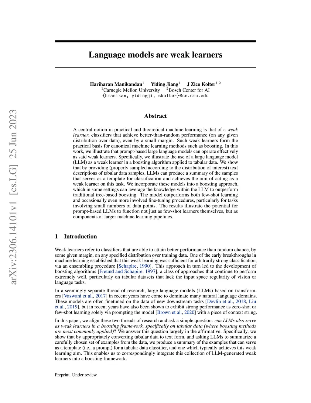 A central notion in practical and theoretical machine learning is that of a , classifiers that achieve better-than-random performance (on any given distribution over data), even by a small margin. Such weak learners form the practical basis for canonical machine learning methods such as boosting. In this work, we illustrate that prompt-based large language models can operate effectively as said weak learners. Specifically, we illustrate the use of a large language model (LLM) as a weak learner in a boosting algorithm applied to tabular data. We show that by providing (properly sampled according to the distribution of interest) text descriptions of tabular data samples, LLMs can produce a summary of the samples that serves as a template for classification and achieves the aim of acting as a weak learner on this task. We incorporate these models into a boosting approach, which in some settings can leverage the knowledge within the LLM to outperform traditional tree-based boosting. The model outperforms both few-shot learning and occasionally even more involved fine-tuning procedures, particularly for tasks involving small numbers of data points. The results illustrate the potential for prompt-based LLMs to function not just as few-shot learners themselves, but as components of larger machine learning pipelines.