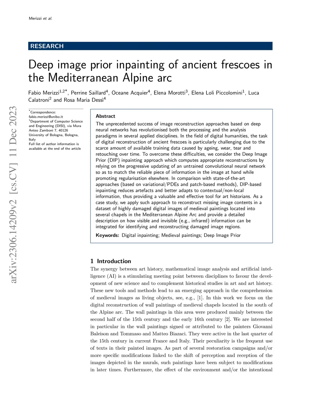 The unprecedented success of image reconstruction approaches based on deep neural networks has revolutionised both the processing and the analysis paradigms in several applied disciplines. In the field of digital humanities, the task of digital reconstruction of ancient frescoes is particularly challenging due to the scarce amount of available training data caused by ageing, wear, tear and retouching over time. To overcome these difficulties, we consider the Deep Image Prior (DIP) inpainting approach which computes appropriate reconstructions by relying on the progressive updating of an untrained convolutional neural network so as to match the reliable piece of information in the image at hand while promoting regularisation elsewhere. In comparison with state-of-the-art approaches (based on variational/PDEs and patch-based methods), DIP-based inpainting reduces artefacts and better adapts to contextual/non-local information, thus providing a valuable and effective tool for art historians. As a case study, we apply such approach to reconstruct missing image contents in a dataset of highly damaged digital images of medieval paintings located into several chapels in the Mediterranean Alpine Arc and provide a detailed description on how visible and invisible (e.g., infrared) information can be integrated for identifying and reconstructing damaged image regions.