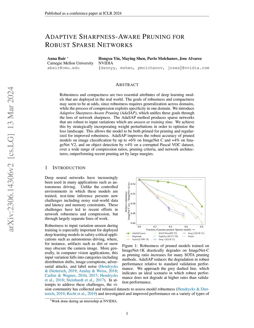 Robustness and compactness are two essential attributes of deep learning models that are deployed in the real world. The goals of robustness and compactness may seem to be at odds, since robustness requires generalization across domains, while the process of compression exploits specificity in one domain. We introduce Adaptive Sharpness-Aware Pruning (AdaSAP), which unifies these goals through the lens of network sharpness. The AdaSAP method produces sparse networks that are robust to input variations which are unseen at training time. We achieve this by strategically incorporating weight perturbations in order to optimize the loss landscape. This allows the model to be both primed for pruning and regularized for improved robustness. AdaSAP improves the robust accuracy of pruned models on image classification by up to +6% on ImageNet C and +4% on ImageNet V2, and on object detection by +4% on a corrupted Pascal VOC dataset, over a wide range of compression ratios, pruning criteria, and network architectures, outperforming recent pruning art by large margins.