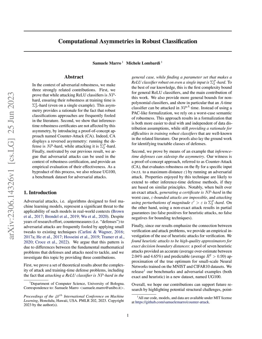 In the context of adversarial robustness, we make three strongly related contributions. First, we prove that while attacking ReLU classifiers is -hard, ensuring their robustness at training time is -hard (even on a single example). This asymmetry provides a rationale for the fact that robust classifications approaches are frequently fooled in the literature. Second, we show that inference-time robustness certificates are not affected by this asymmetry, by introducing a proof-of-concept approach named Counter-Attack (CA). Indeed, CA displays a reversed asymmetry: running the defense is -hard, while attacking it is -hard. Finally, motivated by our previous result, we argue that adversarial attacks can be used in the context of robustness certification, and provide an empirical evaluation of their effectiveness. As a byproduct of this process, we also release UG100, a benchmark dataset for adversarial attacks.