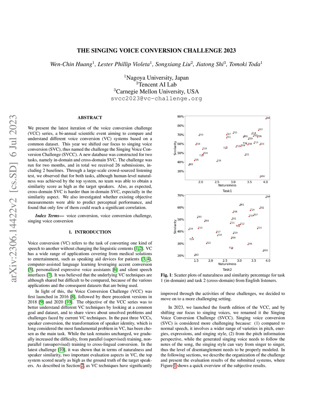 We present the latest iteration of the voice conversion challenge (VCC) series, a bi-annual scientific event aiming to compare and understand different voice conversion (VC) systems based on a common dataset. This year we shifted our focus to singing voice conversion (SVC), thus named the challenge the Singing Voice Conversion Challenge (SVCC). A new database was constructed for two tasks, namely in-domain and cross-domain SVC. The challenge was run for two months, and in total we received 26 submissions, including 2 baselines. Through a large-scale crowd-sourced listening test, we observed that for both tasks, although human-level naturalness was achieved by the top system, no team was able to obtain a similarity score as high as the target speakers. Also, as expected, cross-domain SVC is harder than in-domain SVC, especially in the similarity aspect. We also investigated whether existing objective measurements were able to predict perceptual performance, and found that only few of them could reach a significant correlation.