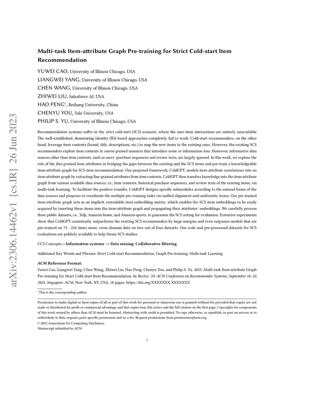 Recommendation systems suffer in the strict cold-start (SCS) scenario, where the user-item interactions are entirely unavailable. The ID-based approaches completely fail to work. Cold-start recommenders, on the other hand, leverage item contents to map the new items to the existing ones. However, the existing SCS recommenders explore item contents in coarse-grained manners that introduce noise or information loss. Moreover, informative data sources other than item contents, such as users' purchase sequences and review texts, are ignored. We explore the role of the fine-grained item attributes in bridging the gaps between the existing and the SCS items and pre-train a knowledgeable item-attribute graph for SCS item recommendation. Our proposed framework, ColdGPT, models item-attribute correlations into an item-attribute graph by extracting fine-grained attributes from item contents. ColdGPT then transfers knowledge into the item-attribute graph from various available data sources, i.e., item contents, historical purchase sequences, and review texts of the existing items, via multi-task learning. To facilitate the positive transfer, ColdGPT designs submodules according to the natural forms of the data sources and coordinates the multiple pre-training tasks via unified alignment-and-uniformity losses. Our pre-trained item-attribute graph acts as an implicit, extendable item embedding matrix, which enables the SCS item embeddings to be easily acquired by inserting these items and propagating their attributes' embeddings. We carefully process three public datasets, i.e., Yelp, Amazon-home, and Amazon-sports, to guarantee the SCS setting for evaluation. Extensive experiments show that ColdGPT consistently outperforms the existing SCS recommenders by large margins and even surpasses models that are pre-trained on 75-224 times more, cross-domain data on two out of four datasets.