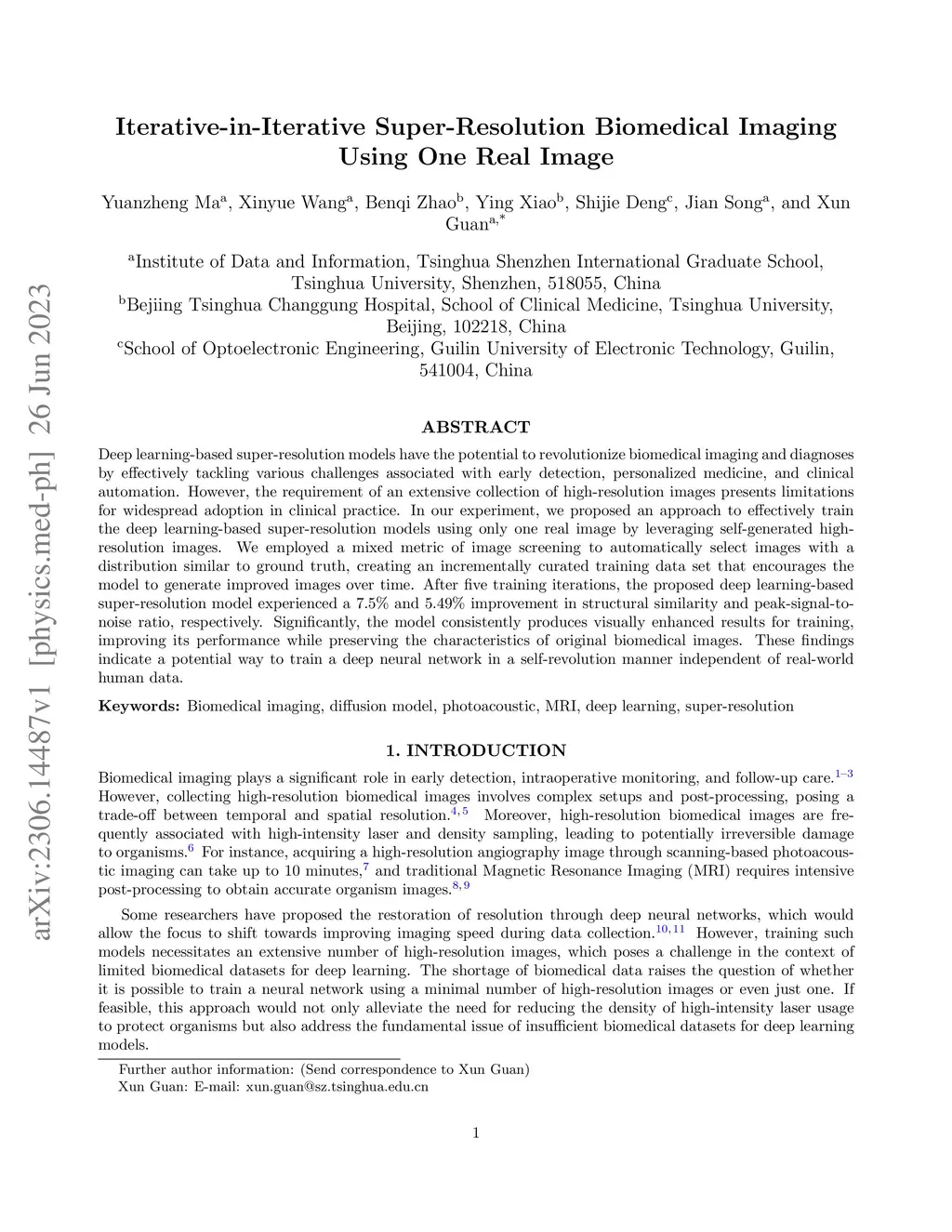 Deep learning-based super-resolution models have the potential to revolutionize biomedical imaging and diagnoses by effectively tackling various challenges associated with early detection, personalized medicine, and clinical automation. However, the requirement of an extensive collection of high-resolution images presents limitations for widespread adoption in clinical practice. In our experiment, we proposed an approach to effectively train the deep learning-based super-resolution models using only one real image by leveraging self-generated high-resolution images. We employed a mixed metric of image screening to automatically select images with a distribution similar to ground truth, creating an incrementally curated training data set that encourages the model to generate improved images over time. After five training iterations, the proposed deep learning-based super-resolution model experienced a 7.5\% and 5.49\% improvement in structural similarity and peak-signal-to-noise ratio, respectively. Significantly, the model consistently produces visually enhanced results for training, improving its performance while preserving the characteristics of original biomedical images. These findings indicate a potential way to train a deep neural network in a self-revolution manner independent of real-world human data.
