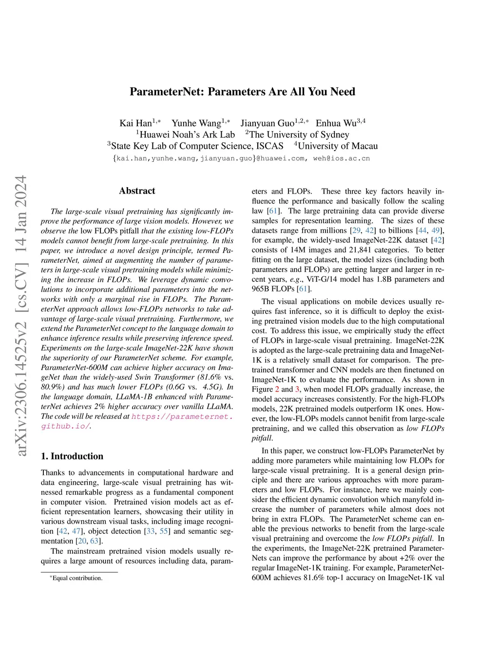 The large-scale visual pretraining has significantly improve the performance of large vision models. However, we observe the \emph{low FLOPs pitfall} that the existing low-FLOPs models cannot benefit from large-scale pretraining. In this paper, we introduce a novel design principle, termed ParameterNet, aimed at augmenting the number of parameters in large-scale visual pretraining models while minimizing the increase in FLOPs. We leverage dynamic convolutions to incorporate additional parameters into the networks with only a marginal rise in FLOPs. The ParameterNet approach allows low-FLOPs networks to take advantage of large-scale visual pretraining. Furthermore, we extend the ParameterNet concept to the language domain to enhance inference results while preserving inference speed. Experiments on the large-scale ImageNet-22K have shown the superiority of our ParameterNet scheme. For example, ParameterNet-600M can achieve higher accuracy on ImageNet than the widely-used Swin Transformer (81.6\% \emph{vs.} 80.9\%) and has much lower FLOPs (0.6G \emph{vs.} 4.5G). In the language domain, LLaMA-1B enhanced with ParameterNet achieves 2\% higher accuracy over vanilla LLaMA. The code will be released at \url{https://parameternet.github.io/}.