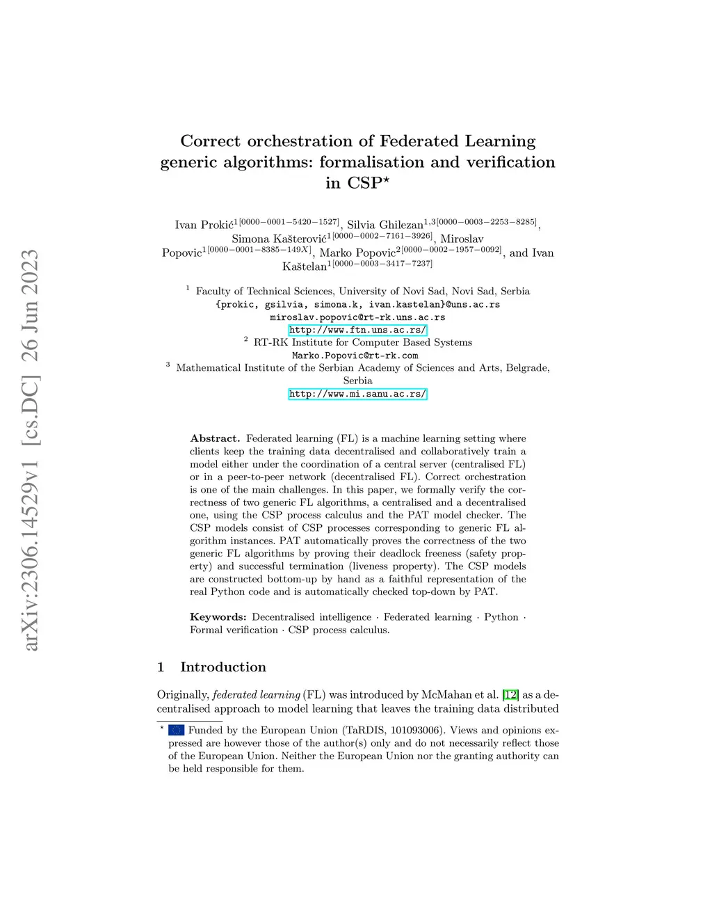 Federated learning (FL) is a machine learning setting where clients keep the training data decentralised and collaboratively train a model either under the coordination of a central server (centralised FL) or in a peer-to-peer network (decentralised FL). Correct orchestration is one of the main challenges. In this paper, we formally verify the correctness of two generic FL algorithms, a centralised and a decentralised one, using the CSP process calculus and the PAT model checker. The CSP models consist of CSP processes corresponding to generic FL algorithm instances. PAT automatically proves the correctness of the two generic FL algorithms by proving their deadlock freeness (safety property) and successful termination (liveness property). The CSP models are constructed bottom-up by hand as a faithful representation of the real Python code and is automatically checked top-down by PAT.