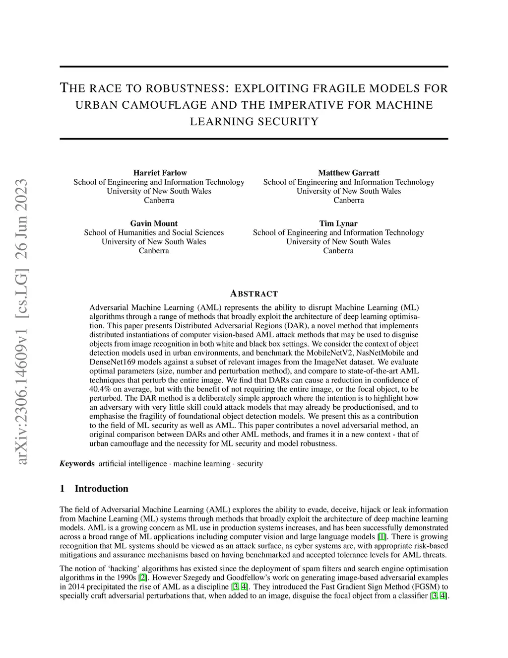 Adversarial Machine Learning (AML) represents the ability to disrupt Machine Learning (ML) algorithms through a range of methods that broadly exploit the architecture of deep learning optimisation. This paper presents Distributed Adversarial Regions (DAR), a novel method that implements distributed instantiations of computer vision-based AML attack methods that may be used to disguise objects from image recognition in both white and black box settings. We consider the context of object detection models used in urban environments, and benchmark the MobileNetV2, NasNetMobile and DenseNet169 models against a subset of relevant images from the ImageNet dataset. We evaluate optimal parameters (size, number and perturbation method), and compare to state-of-the-art AML techniques that perturb the entire image. We find that DARs can cause a reduction in confidence of 40.4% on average, but with the benefit of not requiring the entire image, or the focal object, to be perturbed. The DAR method is a deliberately simple approach where the intention is to highlight how an adversary with very little skill could attack models that may already be productionised, and to emphasise the fragility of foundational object detection models. We present this as a contribution to the field of ML security as well as AML. This paper contributes a novel adversarial method, an original comparison between DARs and other AML methods, and frames it in a new context - that of urban camouflage and the necessity for ML security and model robustness.