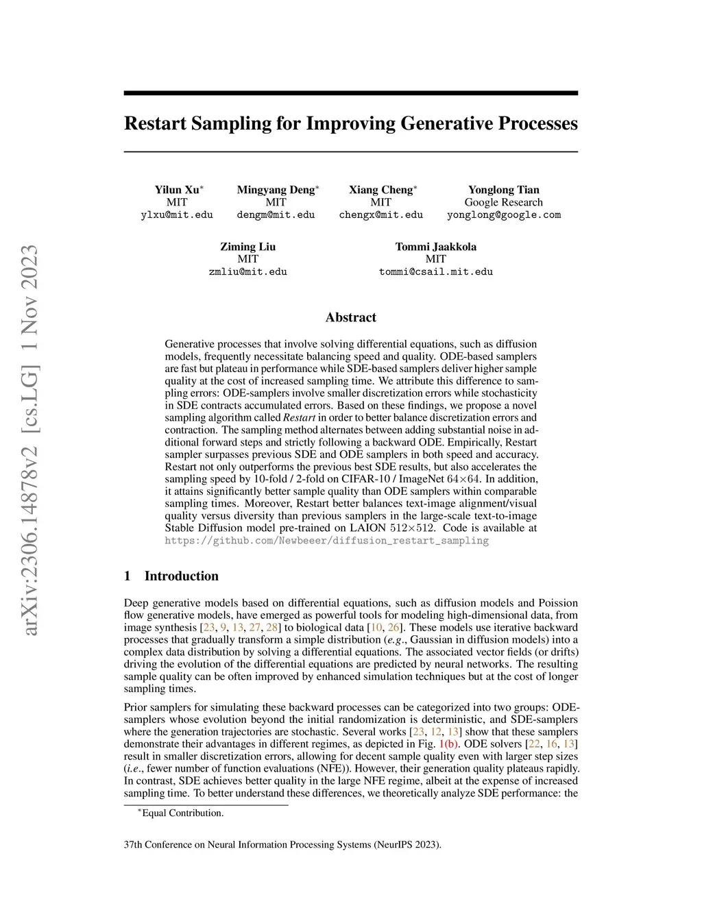 Generative processes that involve solving differential equations, such as diffusion models, frequently necessitate balancing speed and quality. ODE-based samplers are fast but plateau in performance while SDE-based samplers deliver higher sample quality at the cost of increased sampling time. We attribute this difference to sampling errors: ODE-samplers involve smaller discretization errors while stochasticity in SDE contracts accumulated errors. Based on these findings, we propose a novel sampling algorithm called Restart in order to better balance discretization errors and contraction. The sampling method alternates between adding substantial noise in additional forward steps and strictly following a backward ODE. Empirically, Restart sampler surpasses previous SDE and ODE samplers in both speed and accuracy. Restart not only outperforms the previous best SDE results, but also accelerates the sampling speed by 10-fold / 2-fold on CIFAR-10 / ImageNet . In addition, it attains significantly better sample quality than ODE samplers within comparable sampling times. Moreover, Restart better balances text-image alignment/visual quality versus diversity than previous samplers in the large-scale text-to-image Stable Diffusion model pre-trained on LAION . Code is available at https://github.com/Newbeeer/diffusion_restart_sampling