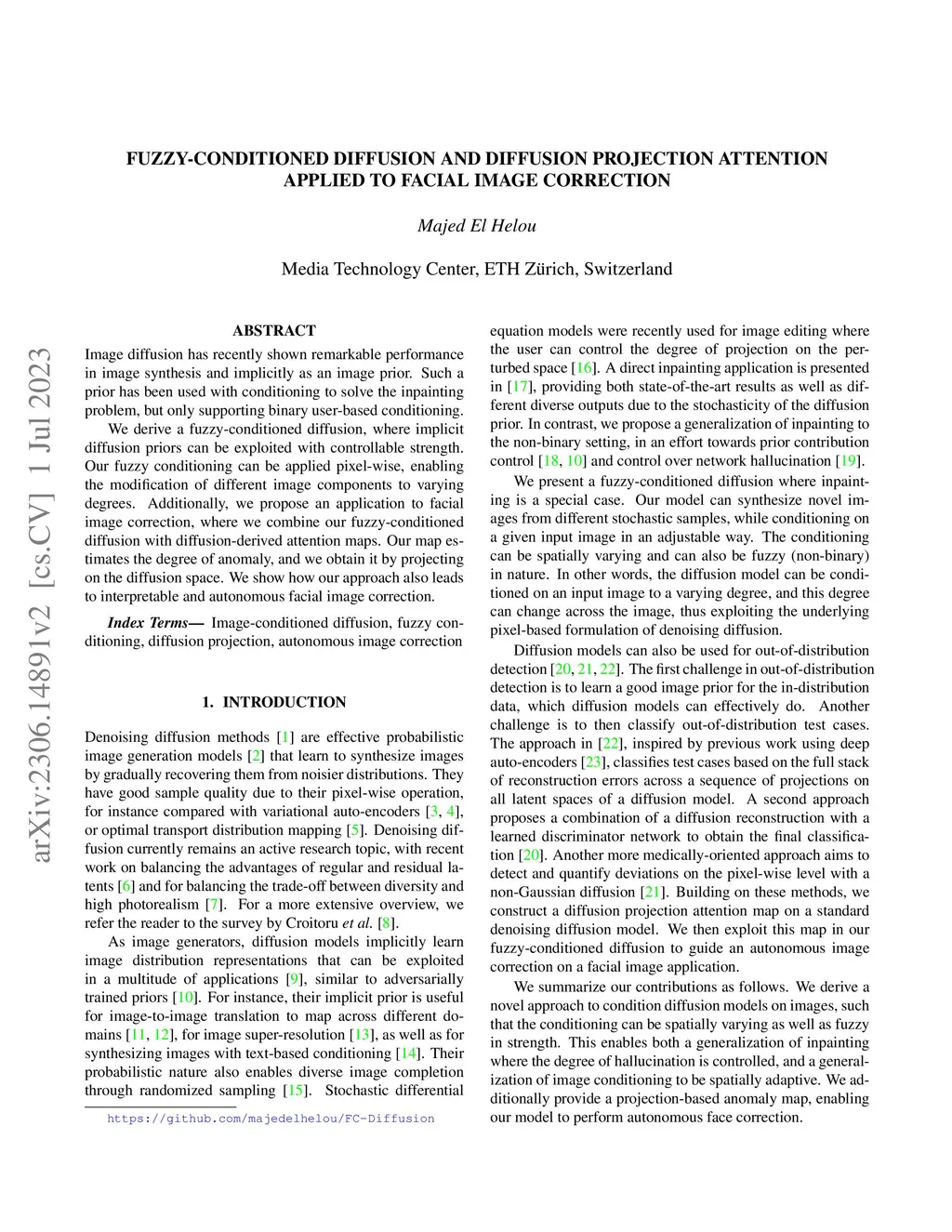 Image diffusion has recently shown remarkable performance in image synthesis and implicitly as an image prior. Such a prior has been used with conditioning to solve the inpainting problem, but only supporting binary user-based conditioning. We derive a fuzzy-conditioned diffusion, where implicit diffusion priors can be exploited with controllable strength. Our fuzzy conditioning can be applied pixel-wise, enabling the modification of different image components to varying degrees. Additionally, we propose an application to facial image correction, where we combine our fuzzy-conditioned diffusion with diffusion-derived attention maps. Our map estimates the degree of anomaly, and we obtain it by projecting on the diffusion space. We show how our approach also leads to interpretable and autonomous facial image correction.