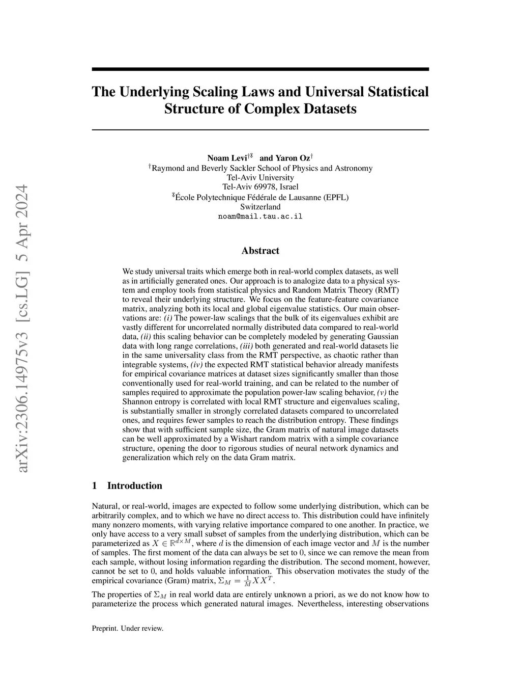 We study universal traits which emerge both in real-world complex datasets, as well as in artificially generated ones. Our approach is to analogize data to a physical system and employ tools from statistical physics and Random Matrix Theory (RMT) to reveal their underlying structure. We focus on the feature-feature covariance matrix, analyzing both its local and global eigenvalue statistics. Our main observations are: (i) The power-law scalings that the bulk of its eigenvalues exhibit are vastly different for uncorrelated normally distributed data compared to real-world data, (ii) this scaling behavior can be completely modeled by generating Gaussian data with long range correlations, (iii) both generated and real-world datasets lie in the same universality class from the RMT perspective, as chaotic rather than integrable systems, (iv) the expected RMT statistical behavior already manifests for empirical covariance matrices at dataset sizes significantly smaller than those conventionally used for real-world training, and can be related to the number of samples required to approximate the population power-law scaling behavior, (v) the Shannon entropy is correlated with local RMT structure and eigenvalues scaling, is substantially smaller in strongly correlated datasets compared to uncorrelated ones, and requires fewer samples to reach the distribution entropy. These findings show that with sufficient sample size, the Gram matrix of natural image datasets can be well approximated by a Wishart random matrix with a simple covariance structure, opening the door to rigorous studies of neural network dynamics and generalization which rely on the data Gram matrix.