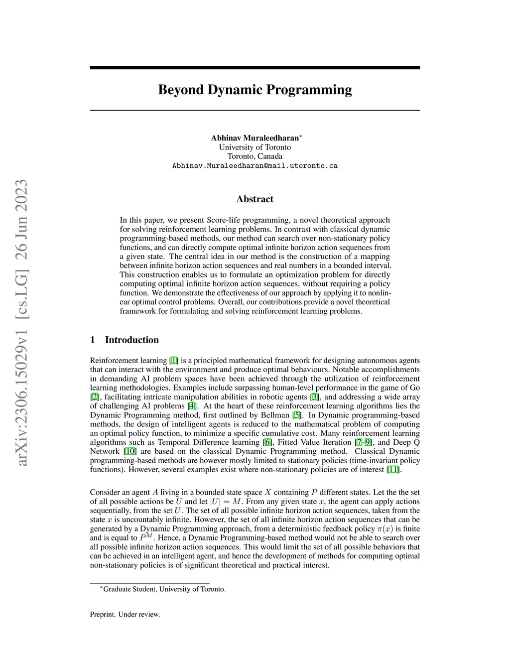 In this paper, we present Score-life programming, a novel theoretical approach for solving reinforcement learning problems. In contrast with classical dynamic programming-based methods, our method can search over non-stationary policy functions, and can directly compute optimal infinite horizon action sequences from a given state. The central idea in our method is the construction of a mapping between infinite horizon action sequences and real numbers in a bounded interval. This construction enables us to formulate an optimization problem for directly computing optimal infinite horizon action sequences, without requiring a policy function. We demonstrate the effectiveness of our approach by applying it to nonlinear optimal control problems. Overall, our contributions provide a novel theoretical framework for formulating and solving reinforcement learning problems.