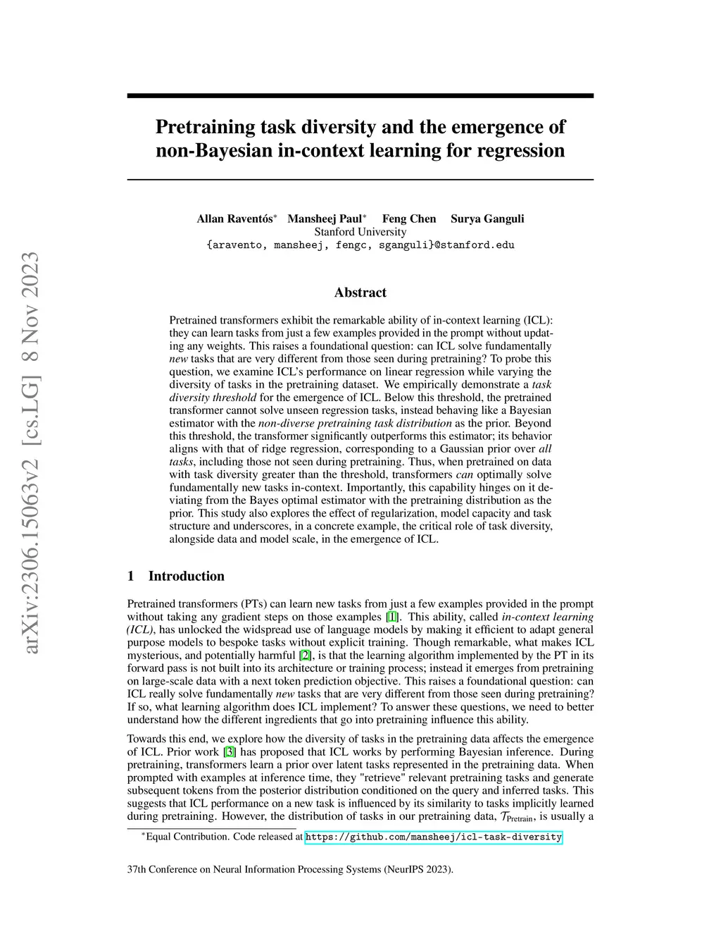 Pretrained transformers exhibit the remarkable ability of in-context learning (ICL): they can learn tasks from just a few examples provided in the prompt without updating any weights. This raises a foundational question: can ICL solve fundamentally tasks that are very different from those seen during pretraining? To probe this question, we examine ICL's performance on linear regression while varying the diversity of tasks in the pretraining dataset. We empirically demonstrate a for the emergence of ICL. Below this threshold, the pretrained transformer cannot solve unseen regression tasks, instead behaving like a Bayesian estimator with the as the prior. Beyond this threshold, the transformer significantly outperforms this estimator; its behavior aligns with that of ridge regression, corresponding to a Gaussian prior over , including those not seen during pretraining. Thus, when pretrained on data with task diversity greater than the threshold, transformers optimally solve fundamentally new tasks in-context. Importantly, this capability hinges on it deviating from the Bayes optimal estimator with the pretraining distribution as the prior. This study also explores the effect of regularization, model capacity and task structure and underscores, in a concrete example, the critical role of task diversity, alongside data and model scale, in the emergence of ICL. Code is available at https://github.com/mansheej/icl-task-diversity.