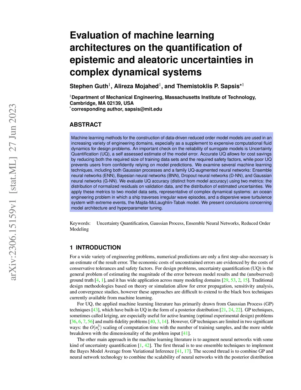 Machine learning methods for the construction of data-driven reduced order model models are used in an increasing variety of engineering domains, especially as a supplement to expensive computational fluid dynamics for design problems. An important check on the reliability of surrogate models is Uncertainty Quantification (UQ), a self assessed estimate of the model error. Accurate UQ allows for cost savings by reducing both the required size of training data sets and the required safety factors, while poor UQ prevents users from confidently relying on model predictions. We examine several machine learning techniques, including both Gaussian processes and a family UQ-augmented neural networks: Ensemble neural networks (ENN), Bayesian neural networks (BNN), Dropout neural networks (D-NN), and Gaussian neural networks (G-NN). We evaluate UQ accuracy (distinct from model accuracy) using two metrics: the distribution of normalized residuals on validation data, and the distribution of estimated uncertainties. We apply these metrics to two model data sets, representative of complex dynamical systems: an ocean engineering problem in which a ship traverses irregular wave episodes, and a dispersive wave turbulence system with extreme events, the Majda-McLaughlin-Tabak model. We present conclusions concerning model architecture and hyperparameter tuning.