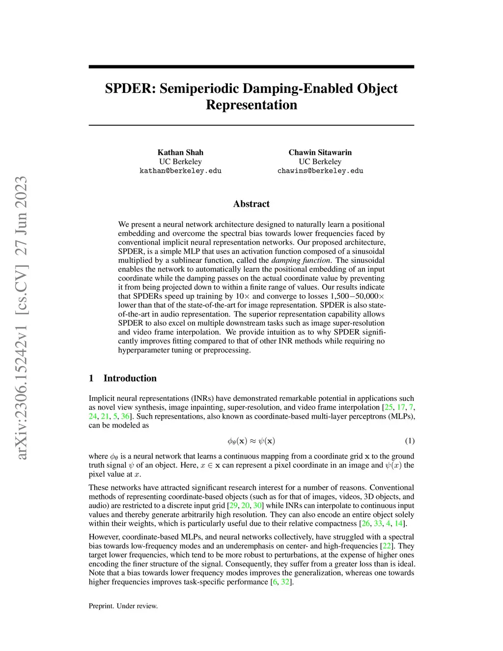 We present a neural network architecture designed to naturally learn a positional embedding and overcome the spectral bias towards lower frequencies faced by conventional activation functions. Our proposed architecture, SPDER, is a simple MLP that uses an activation function composed of a sinusoidal multiplied by a sublinear function, called the damping function. The sinusoidal enables the network to automatically learn the positional embedding of an input coordinate while the damping passes on the actual coordinate value by preventing it from being projected down to within a finite range of values. Our results indicate that SPDERs speed up training by 10x and converge to losses 1,500-50,000x lower than that of the state-of-the-art for image representation. SPDER is also state-of-the-art in audio representation. The superior representation capability allows SPDER to also excel on multiple downstream tasks such as image super-resolution and video frame interpolation. We provide intuition as to why SPDER significantly improves fitting compared to that of other INR methods while requiring no hyperparameter tuning or preprocessing.