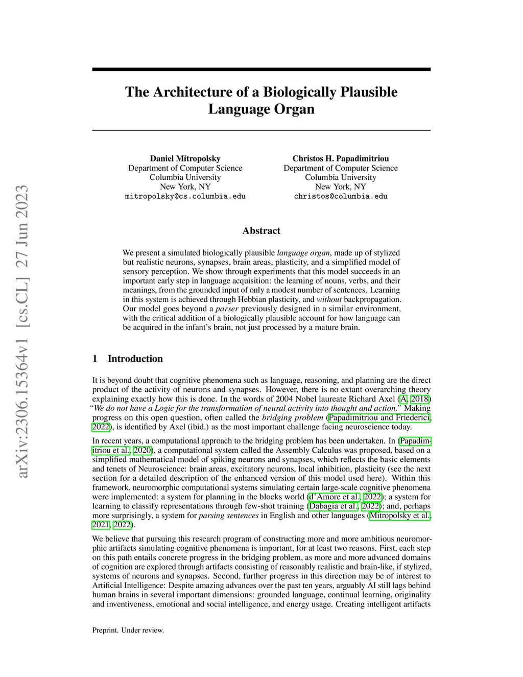 We present a simulated biologically plausible language organ, made up of stylized but realistic neurons, synapses, brain areas, plasticity, and a simplified model of sensory perception. We show through experiments that this model succeeds in an important early step in language acquisition: the learning of nouns, verbs, and their meanings, from the grounded input of only a modest number of sentences. Learning in this system is achieved through Hebbian plasticity, and without backpropagation. Our model goes beyond a parser previously designed in a similar environment, with the critical addition of a biologically plausible account for how language can be acquired in the infant's brain, not just processed by a mature brain.