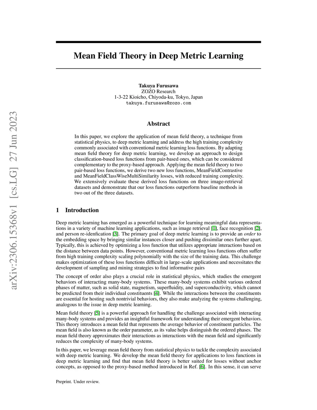 In this paper, we explore the application of mean field theory, a technique from statistical physics, to deep metric learning and address the high training complexity commonly associated with conventional metric learning loss functions. By adapting mean field theory for deep metric learning, we develop an approach to design classification-based loss functions from pair-based ones, which can be considered complementary to the proxy-based approach. Applying the mean field theory to two pair-based loss functions, we derive two new loss functions, MeanFieldContrastive and MeanFieldClassWiseMultiSimilarity losses, with reduced training complexity. We extensively evaluate these derived loss functions on three image-retrieval datasets and demonstrate that our loss functions outperform baseline methods in two out of the three datasets.