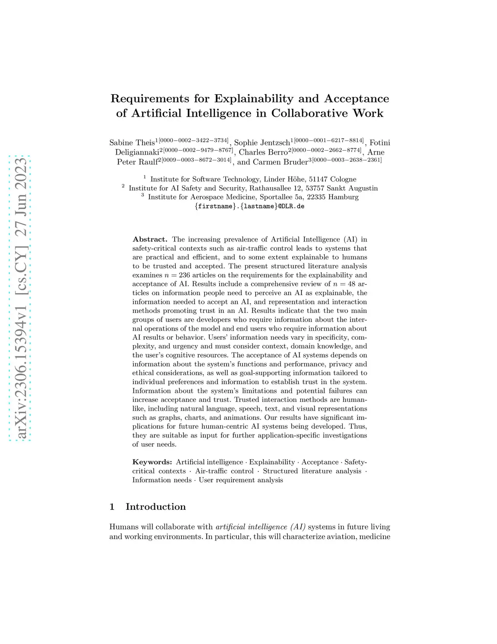The increasing prevalence of Artificial Intelligence (AI) in safety-critical contexts such as air-traffic control leads to systems that are practical and efficient, and to some extent explainable to humans to be trusted and accepted. The present structured literature analysis examines n = 236 articles on the requirements for the explainability and acceptance of AI. Results include a comprehensive review of n = 48 articles on information people need to perceive an AI as explainable, the information needed to accept an AI, and representation and interaction methods promoting trust in an AI. Results indicate that the two main groups of users are developers who require information about the internal operations of the model and end users who require information about AI results or behavior. Users' information needs vary in specificity, complexity, and urgency and must consider context, domain knowledge, and the user's cognitive resources. The acceptance of AI systems depends on information about the system's functions and performance, privacy and ethical considerations, as well as goal-supporting information tailored to individual preferences and information to establish trust in the system. Information about the system's limitations and potential failures can increase acceptance and trust. Trusted interaction methods are human-like, including natural language, speech, text, and visual representations such as graphs, charts, and animations. Our results have significant implications for future human-centric AI systems being developed. Thus, they are suitable as input for further application-specific investigations of user needs.