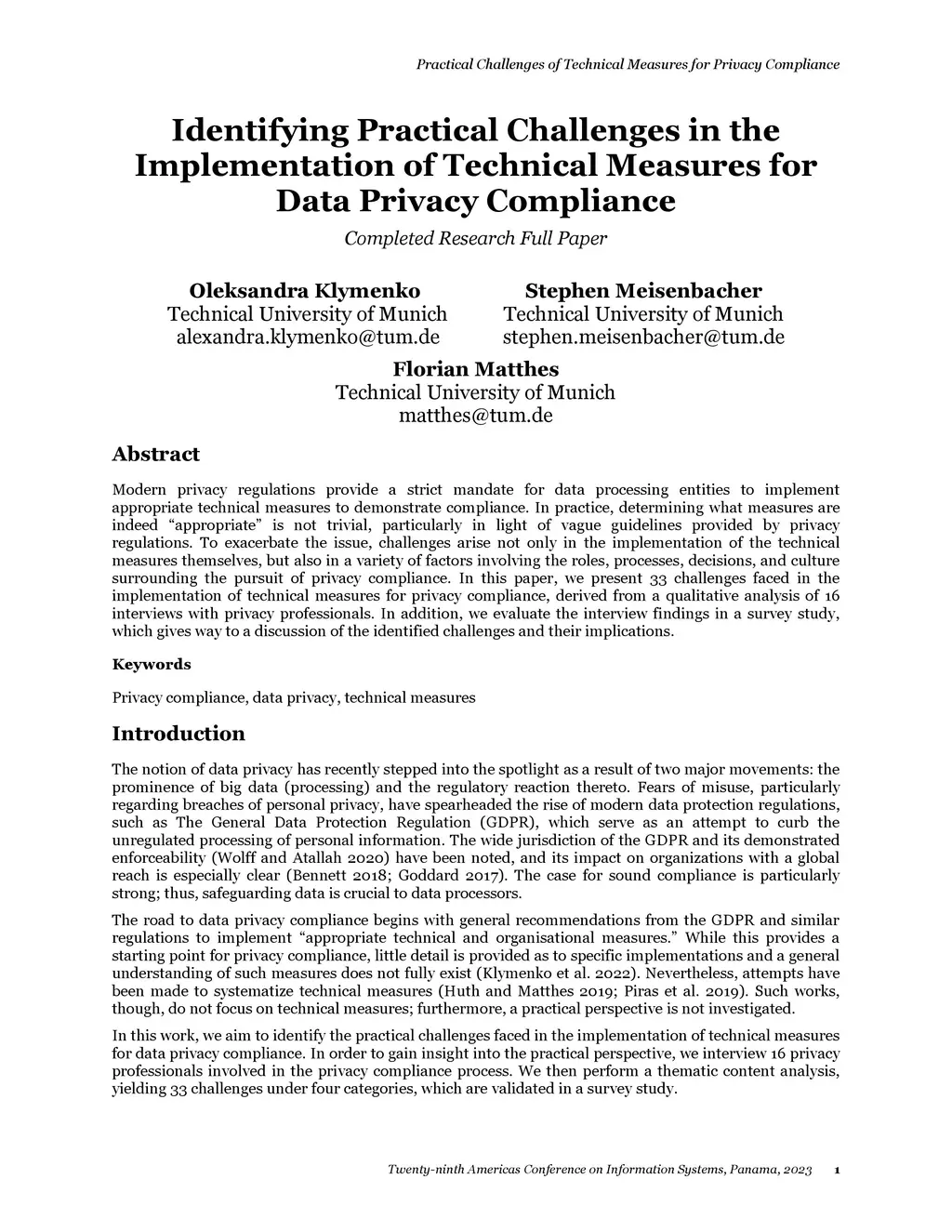 Modern privacy regulations provide a strict mandate for data processing entities to implement appropriate technical measures to demonstrate compliance. In practice, determining what measures are indeed "appropriate" is not trivial, particularly in light of vague guidelines provided by privacy regulations. To exacerbate the issue, challenges arise not only in the implementation of the technical measures themselves, but also in a variety of factors involving the roles, processes, decisions, and culture surrounding the pursuit of privacy compliance. In this paper, we present 33 challenges faced in the implementation of technical measures for privacy compliance, derived from a qualitative analysis of 16 interviews with privacy professionals. In addition, we evaluate the interview findings in a survey study, which gives way to a discussion of the identified challenges and their implications.