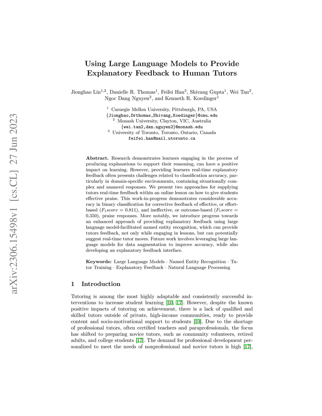 Research demonstrates learners engaging in the process of producing explanations to support their reasoning, can have a positive impact on learning. However, providing learners real-time explanatory feedback often presents challenges related to classification accuracy, particularly in domain-specific environments, containing situationally complex and nuanced responses. We present two approaches for supplying tutors real-time feedback within an online lesson on how to give students effective praise. This work-in-progress demonstrates considerable accuracy in binary classification for corrective feedback of effective, or effort-based (F1 score = 0.811), and ineffective, or outcome-based (F1 score = 0.350), praise responses. More notably, we introduce progress towards an enhanced approach of providing explanatory feedback using large language model-facilitated named entity recognition, which can provide tutors feedback, not only while engaging in lessons, but can potentially suggest real-time tutor moves. Future work involves leveraging large language models for data augmentation to improve accuracy, while also developing an explanatory feedback interface.