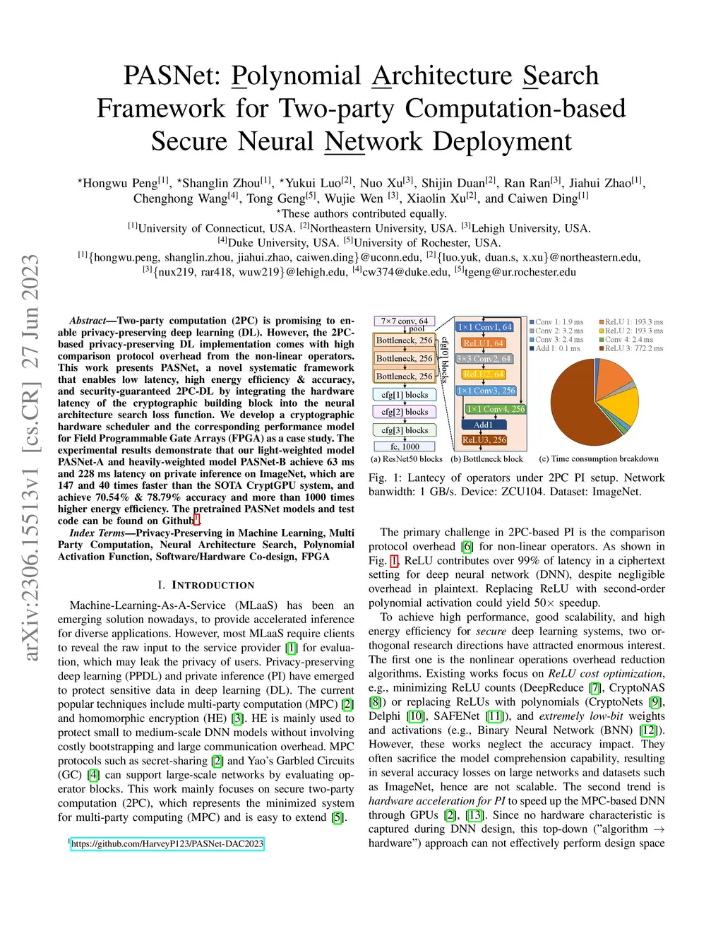 Two-party computation (2PC) is promising to enable privacy-preserving deep learning (DL). However, the 2PC-based privacy-preserving DL implementation comes with high comparison protocol overhead from the non-linear operators. This work presents PASNet, a novel systematic framework that enables low latency, high energy efficiency & accuracy, and security-guaranteed 2PC-DL by integrating the hardware latency of the cryptographic building block into the neural architecture search loss function. We develop a cryptographic hardware scheduler and the corresponding performance model for Field Programmable Gate Arrays (FPGA) as a case study. The experimental results demonstrate that our light-weighted model PASNet-A and heavily-weighted model PASNet-B achieve 63 ms and 228 ms latency on private inference on ImageNet, which are 147 and 40 times faster than the SOTA CryptGPU system, and achieve 70.54% & 78.79% accuracy and more than 1000 times higher energy efficiency.